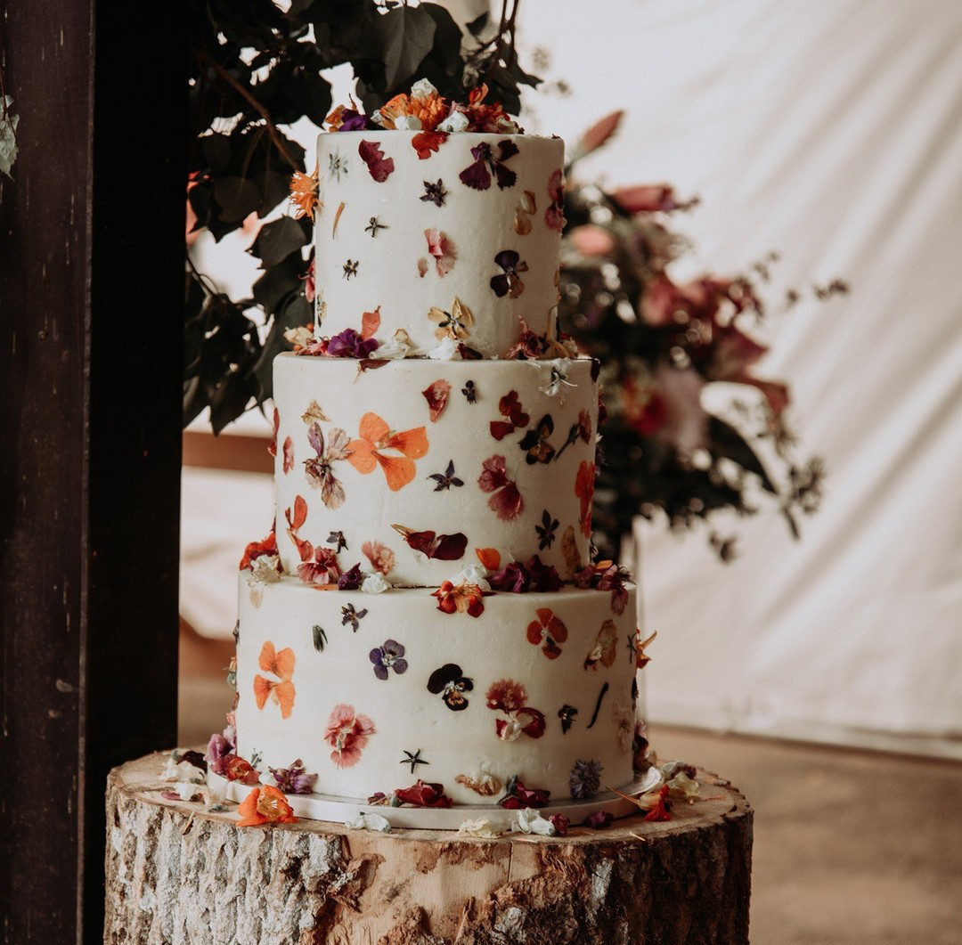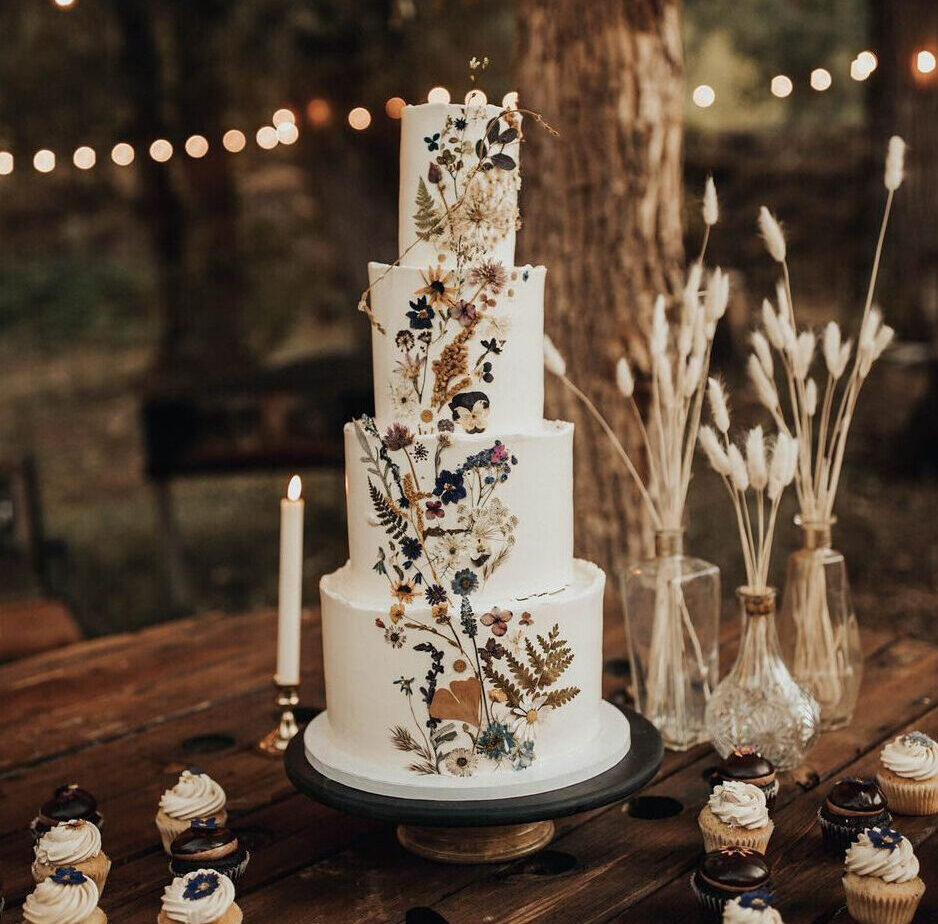 A cake adorned with dried or pressed flowers can transform your dessert from run of the mill to something elegant and special. One of the most impressive aspects of this style cake is they can be as dressed up or dressed down to fit the wedding theme and style.