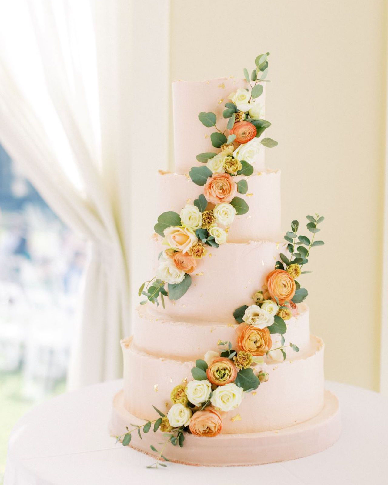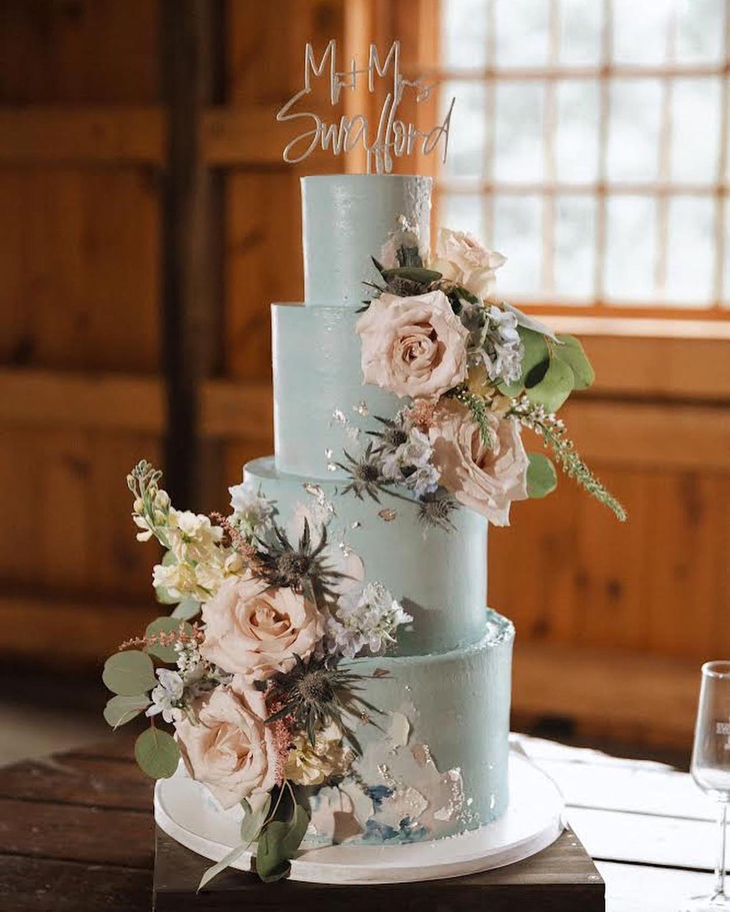 We know many brides love adding flowers to their cakes. A unique take on this trend is to incorporate this is by adding a cascading floral arrangement around the cake. You can also tie the colors from your wedding theme into the florals, as well as your bouquets and bridesmaid dresses to create a cohesive look.