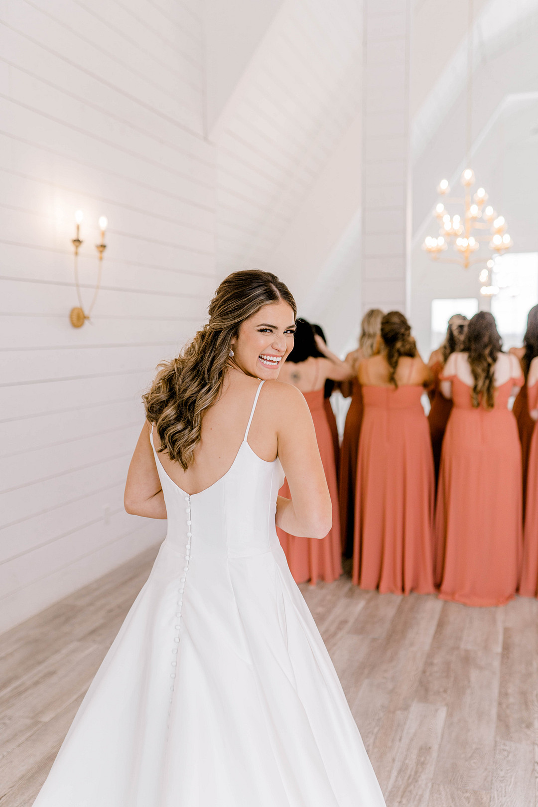 “Meredith chose a beautiful, warm palette of terracotta, peach, sand, and blush tones for her signature wedding day colors. Her bouquet full of garden roses and hydrangeas looked lovely next to her classic dress. Meredith wore blue hair pins from her grandmother and mother in her hair to represent ‘something blue.'” — Christen Westcott