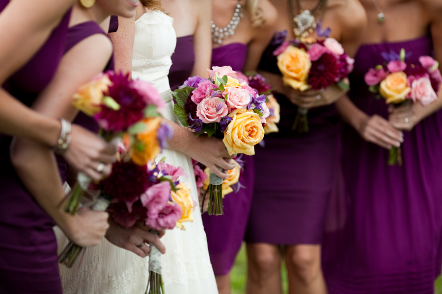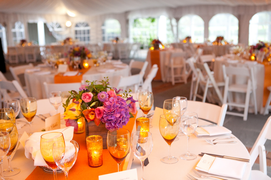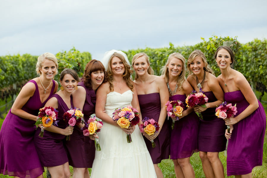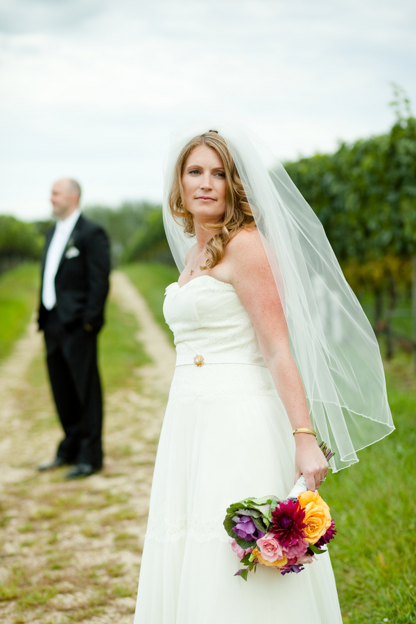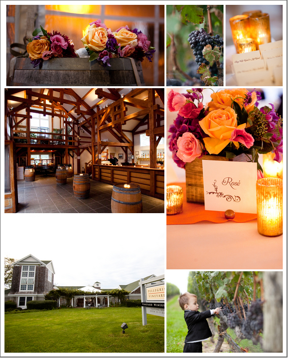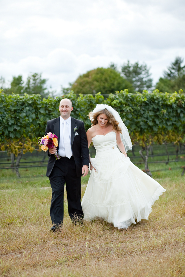 I have featured many rustic farm style weddings from many different locations but there have been very few from Long Island in New York. Today’s real wedding took place at Pellegrini Vineyards out on the tip of Long Island and offered not only fun rustic touches but great vintage ones as well. Pay close attention to the beautiful flowers this bride chose, not only are they in a beautiful warm fall color pallet but they seem to fit the vineyard location perfectly and the wood box that centerpieces are in make the table rustic and elegant.