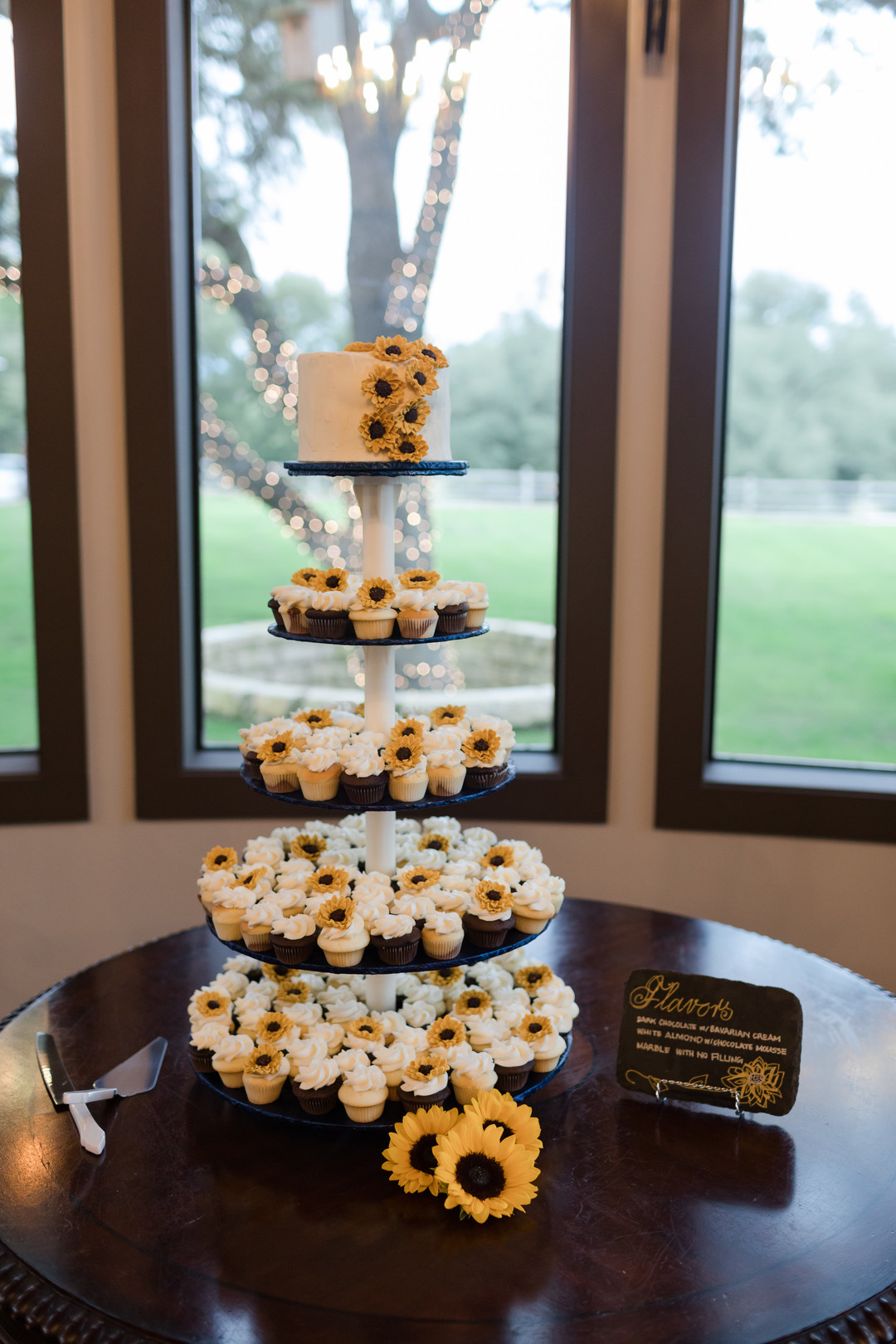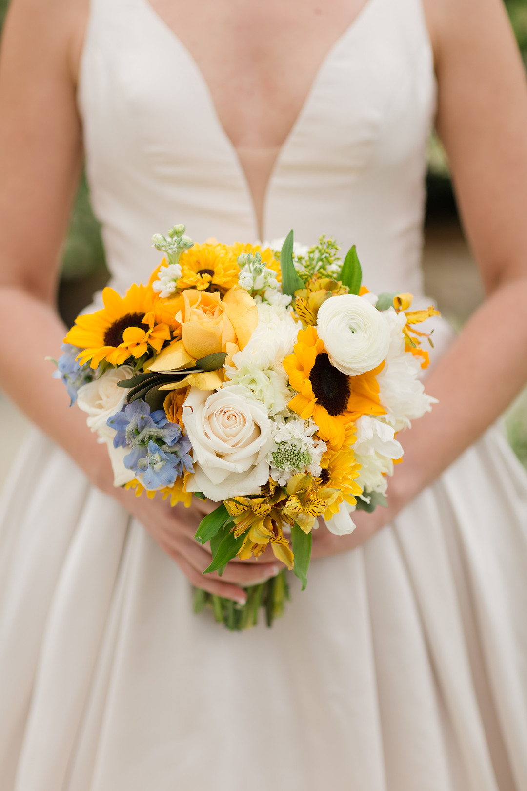 Sunflower weddings are one of our all time favorite wedding themes and this wedding is no exception. From the photographer: To say their wedding details were beautiful would be an understatement! Everything was perfect and so meaningful! Sunflowers were the overarching theme of the day (as it is Sara’s favorite flower) and also the state flower of Kansas, her home state. Sara looked gorgeous in her champagne wedding gown with plunging neckline and lace-beaded details covering her back. The bridesmaids wore dusty blue chiffon gowns while the groomsmen were dressed in navy suits–Viktor’s favorite color. The dinner tables were adorned in champagne table cloths with navy lace runners and cloth napkins, and the centerpieces were composed of sunflowers and daisies in mason jars sitting on rustic slices of wood. Every detail was the perfect choice for Sara and Viktor, and created a lovely backdrop for their wedding celebration. Thanks to Pure in Art Photography for sharing this amazing wedding with us today.
