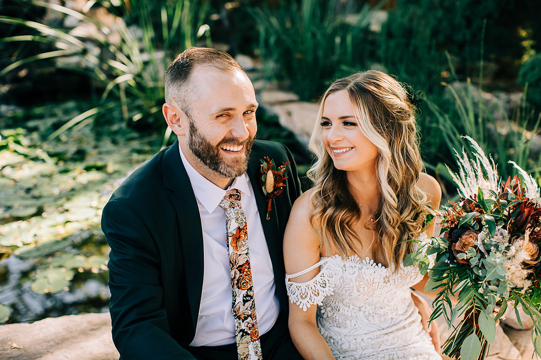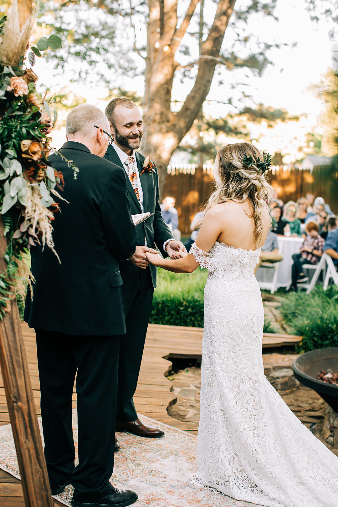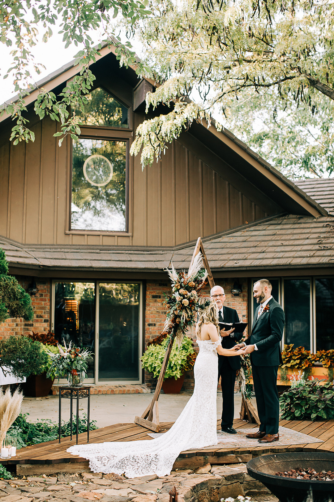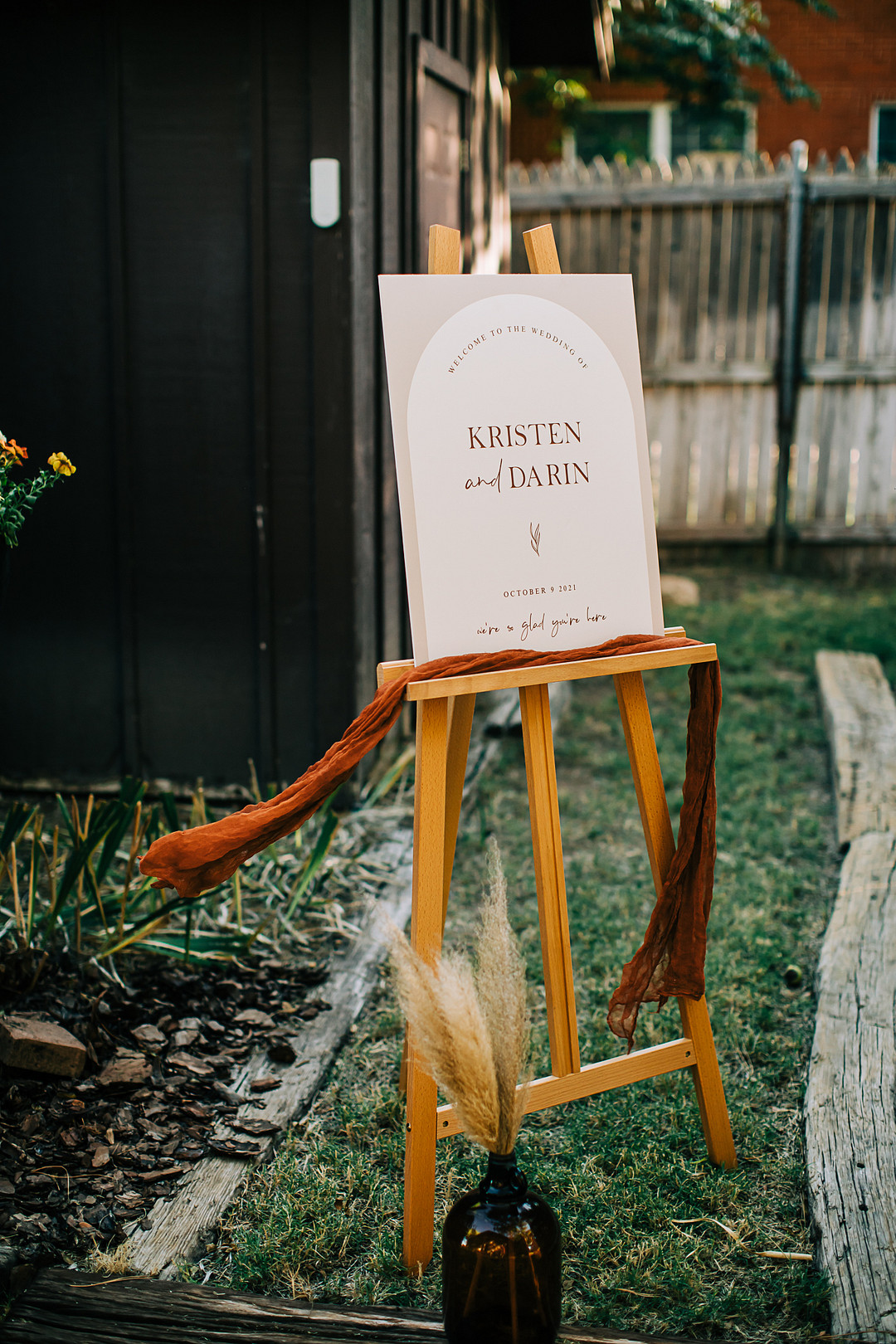 Two words: backyard wedding! Whether you’re planning one or just looking for inspiration, today’s real wedding feature is guaranteed to check all your boxes. In October 2021, Kristen & Darin tied the knot in a sweet ceremony in their friend’s gorgeous backyard. They brought their bohemian wedding dreams to life and decorated the space with natural pampas grass, palm leaves, and colorful bohemian-inspired rugs. Keep scrolling to see more highlights from this bohemian backyard wedding in Texas.