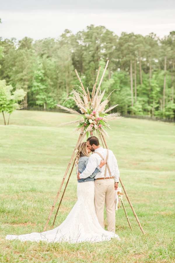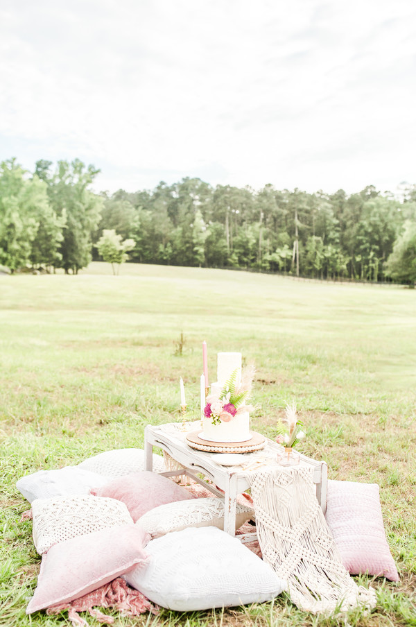 With a twist on this boho shoot, we brought the backyard picnic to you. Set up in the middle of a horse field, we created a handmade teepee made out of bamboo and a huge floral arrangement. We also wanted the picnic to be classy, yet comfy. That’s why we choose such trendy, nice tablescape with the most comfy pillow to accent it!
