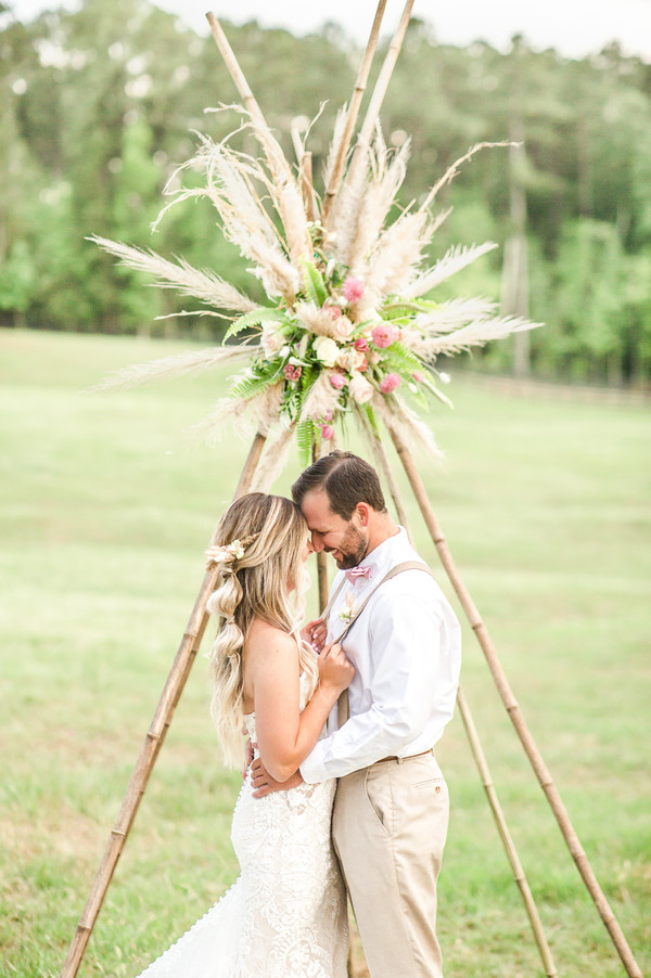 This light and airy boho style wedding inspiration has stolen our hearts with its soft color theme and beautiful outdoor venue. From the photography: The new and trendy wedding theme is all things boho, but usually you’ll find these images dark and moody. Because isn’t that what people think of when they see a bohemian inspired shoot? Not this one! We wanted to give people a view on a bright and airy bohemian shoot with pinks, greens, and neutrals! The perfect palette for the trendy, bohemian bride who loves all this bright and airy. Thanks to Katherine Beasley Photography for sharing!