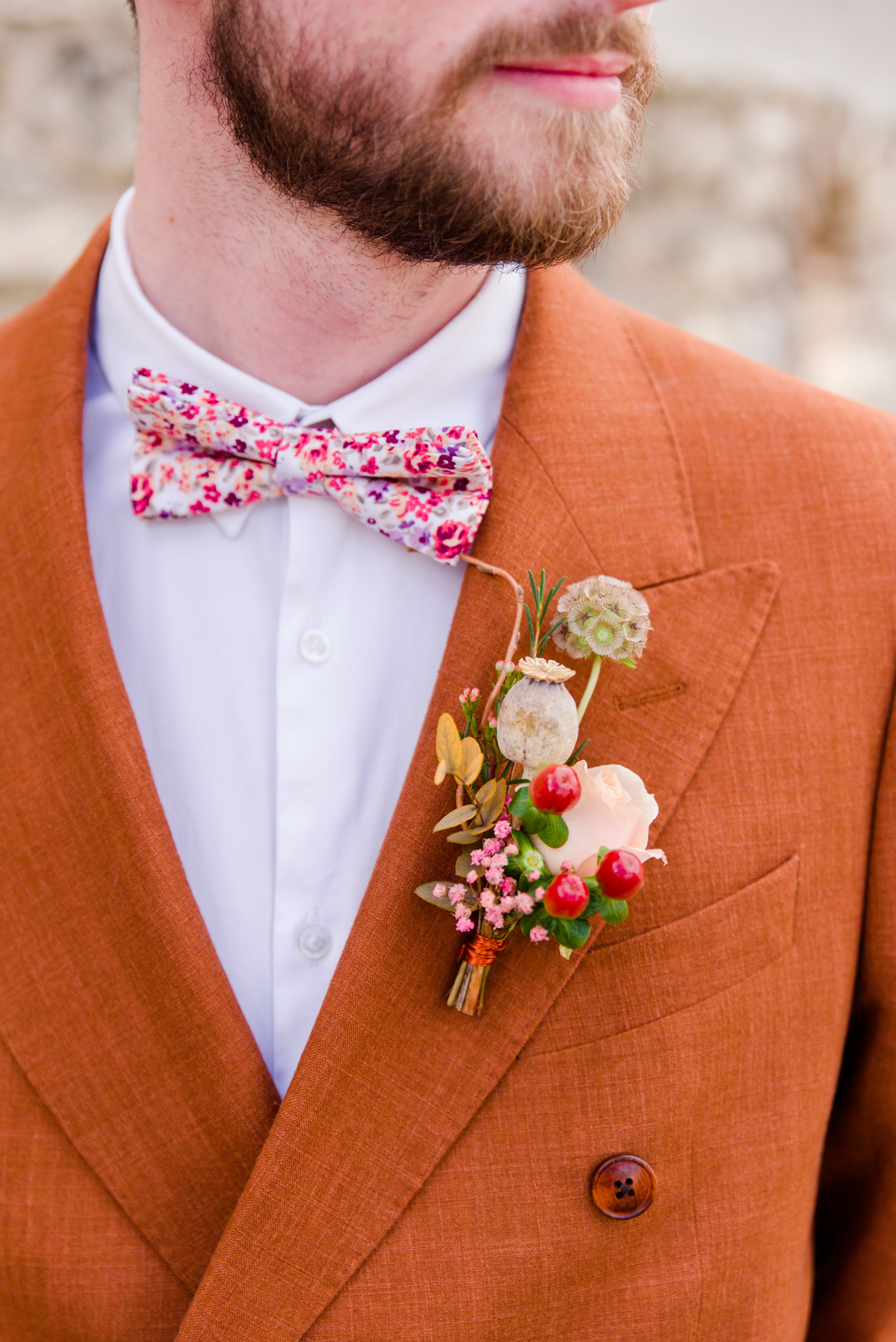 Warm terracotta, pops of pink, and pampas grass are the standout details of this styled shoot. A micro wedding with a boho twist, this gives you all the inspiration for bringing your small setting to life. From the photographer: The shoot took place in France during the winter and brings pretty, cozy vibes to the indoors. The neutral tones of the venue made it possible to highlight the floral arch. The dried flowers and the earthy colors of terracotta brought a very natural and floral aspect to this project. Thanks to Pierre & Julia for capturing and sharing this intimate boho micro wedding inspiration shoot with us.