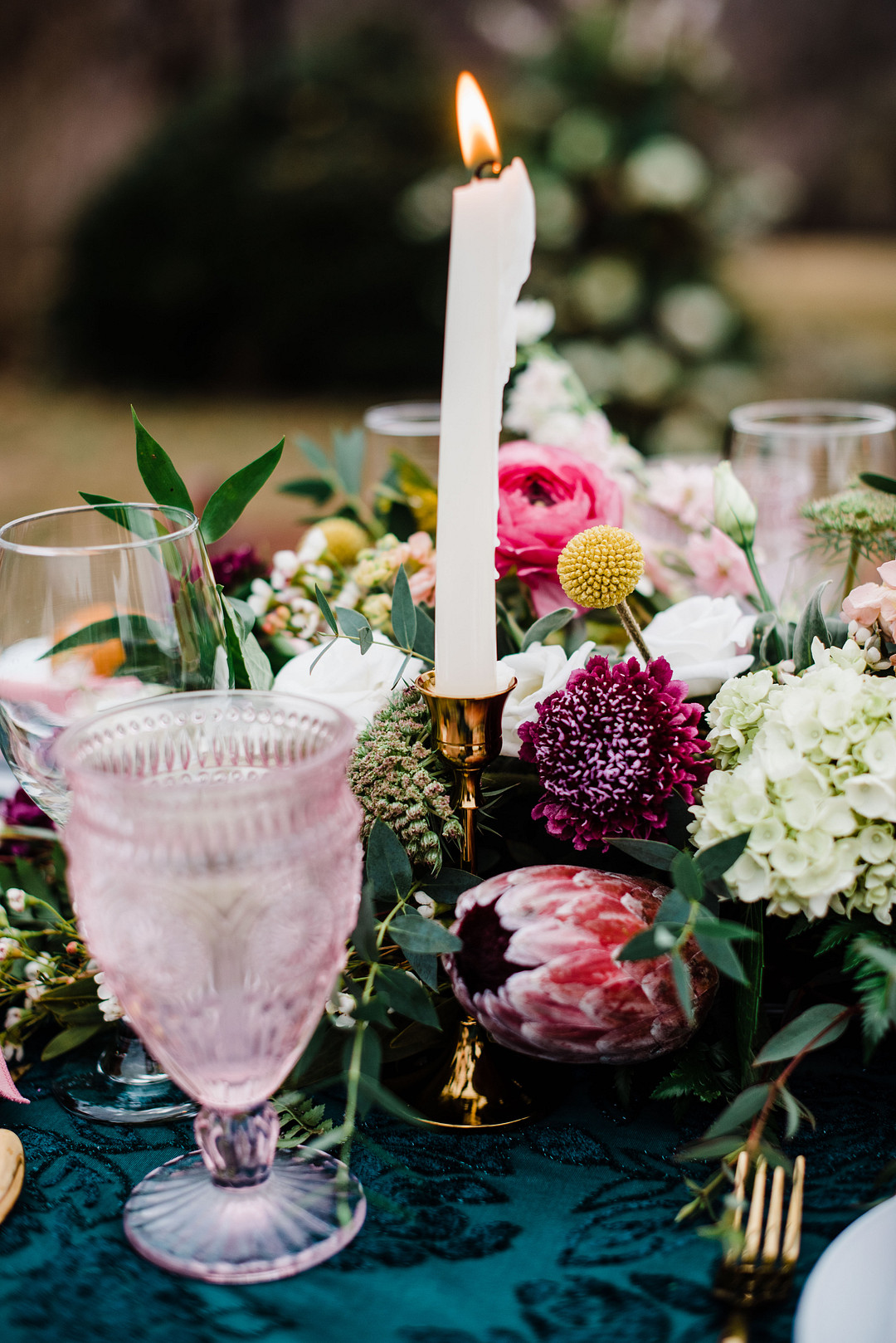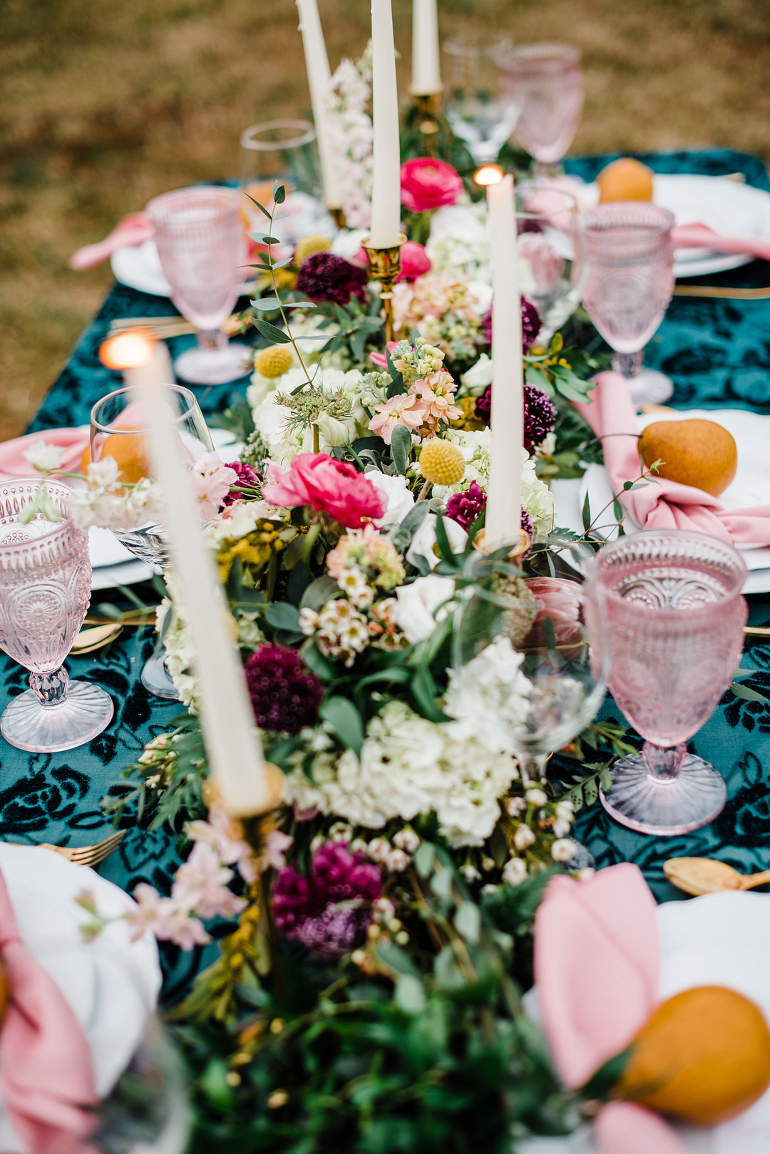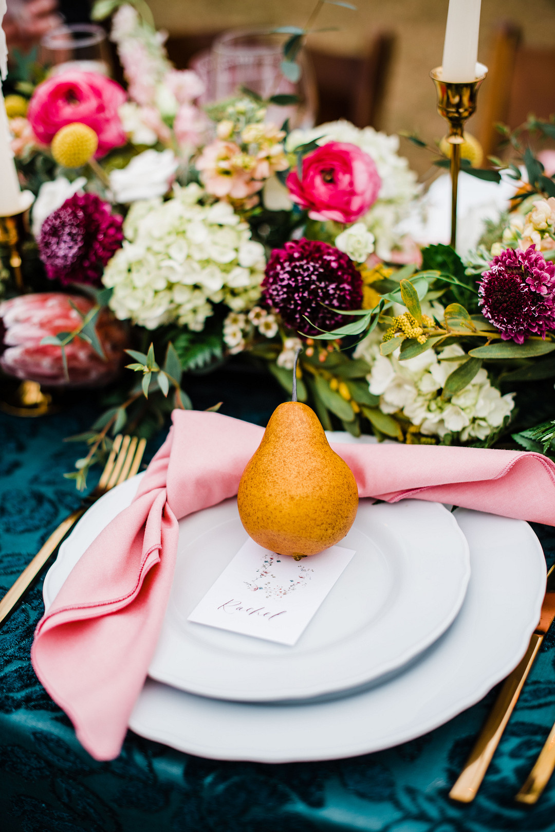 “The emerald velvet linens with pops of pinks, golds, and whites were so beautiful set in front of the mountain views at Belle Garden Estate.” –Kaytlin Lane Photography