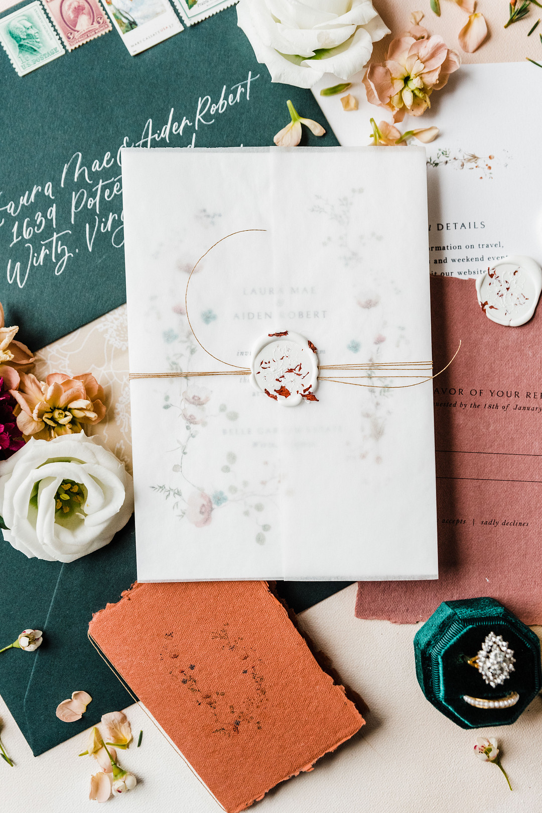 ” The invitation suite was beautiful with pops of color, hand-drawn floral envelope linings and so many little details to give that extra flare.”-Kaytlin Lane Photography