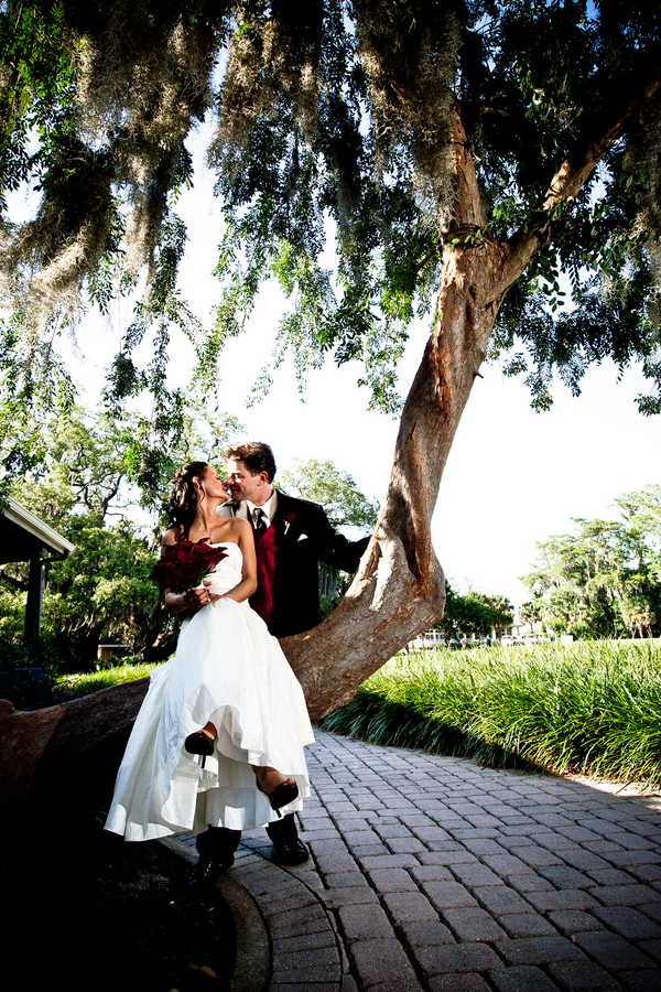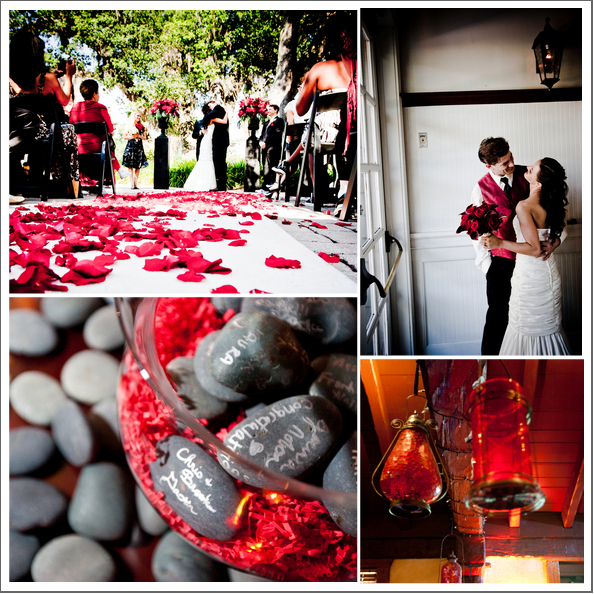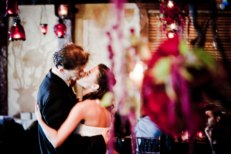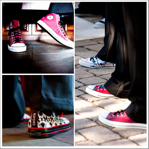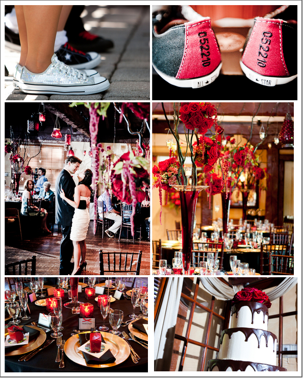 When a couple lets their spirit shine through to the many elements of their wedding it results in a wonderful personal experience. This wedding features sparkly sneakers, Chuck Taylors for the guys and a gorgeous deep red color pallet. This dark red color works very nicely in almost any season – match it up with a soft pink for the summer, light blush tones for the spring, burnt oranges for the fall and rich browns & white for the winter. Check out how fun the brides dress is when it transform from long to short.