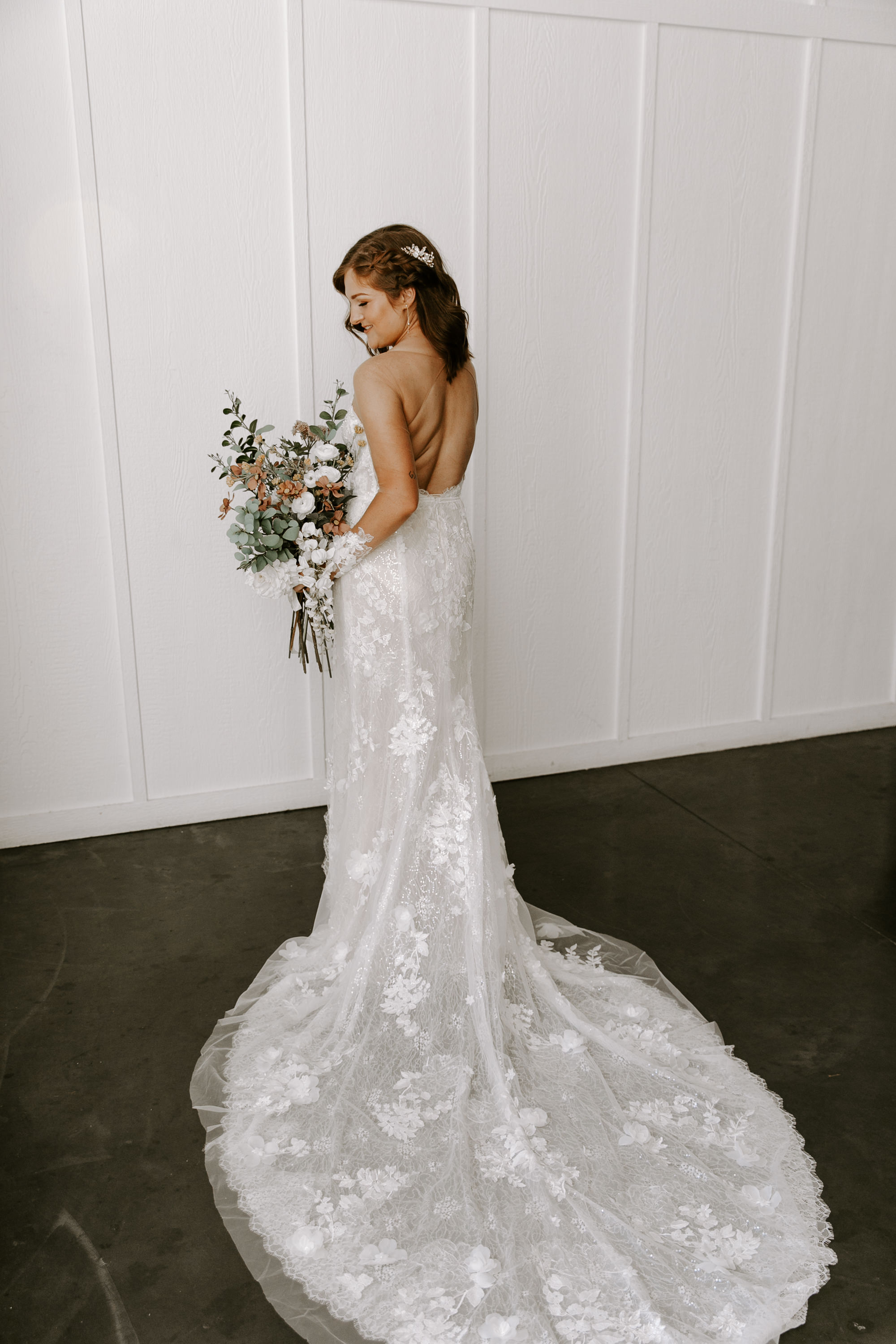 “My dress was so unique and stunning. I personally have never seen a dress even remotely like it at any wedding I’ve attended or on social media anywhere. I absolutely loved the mesh detailing from the deep v-cut to the long sleeves and 3D floral detail throughout.” – Andrea