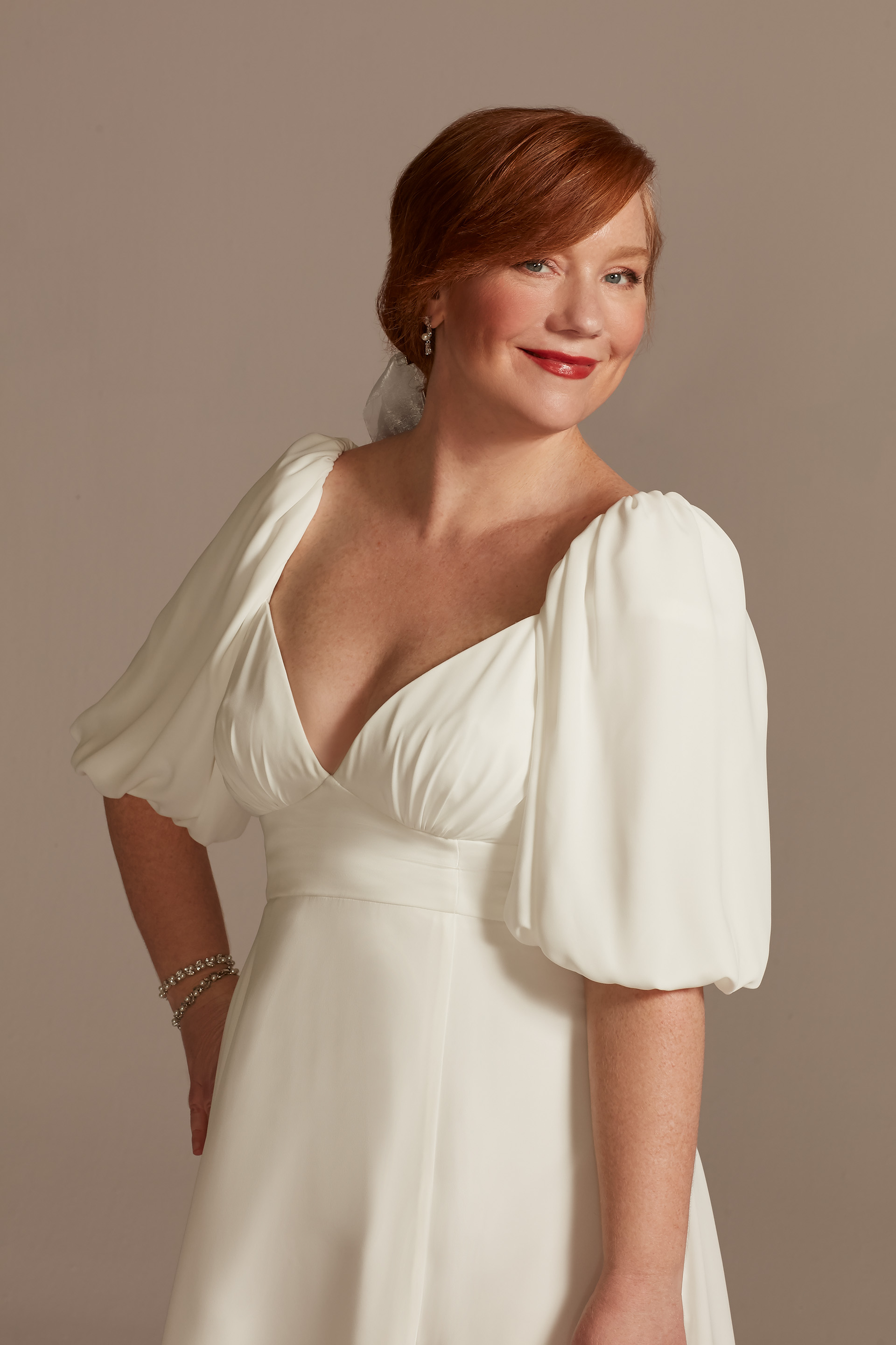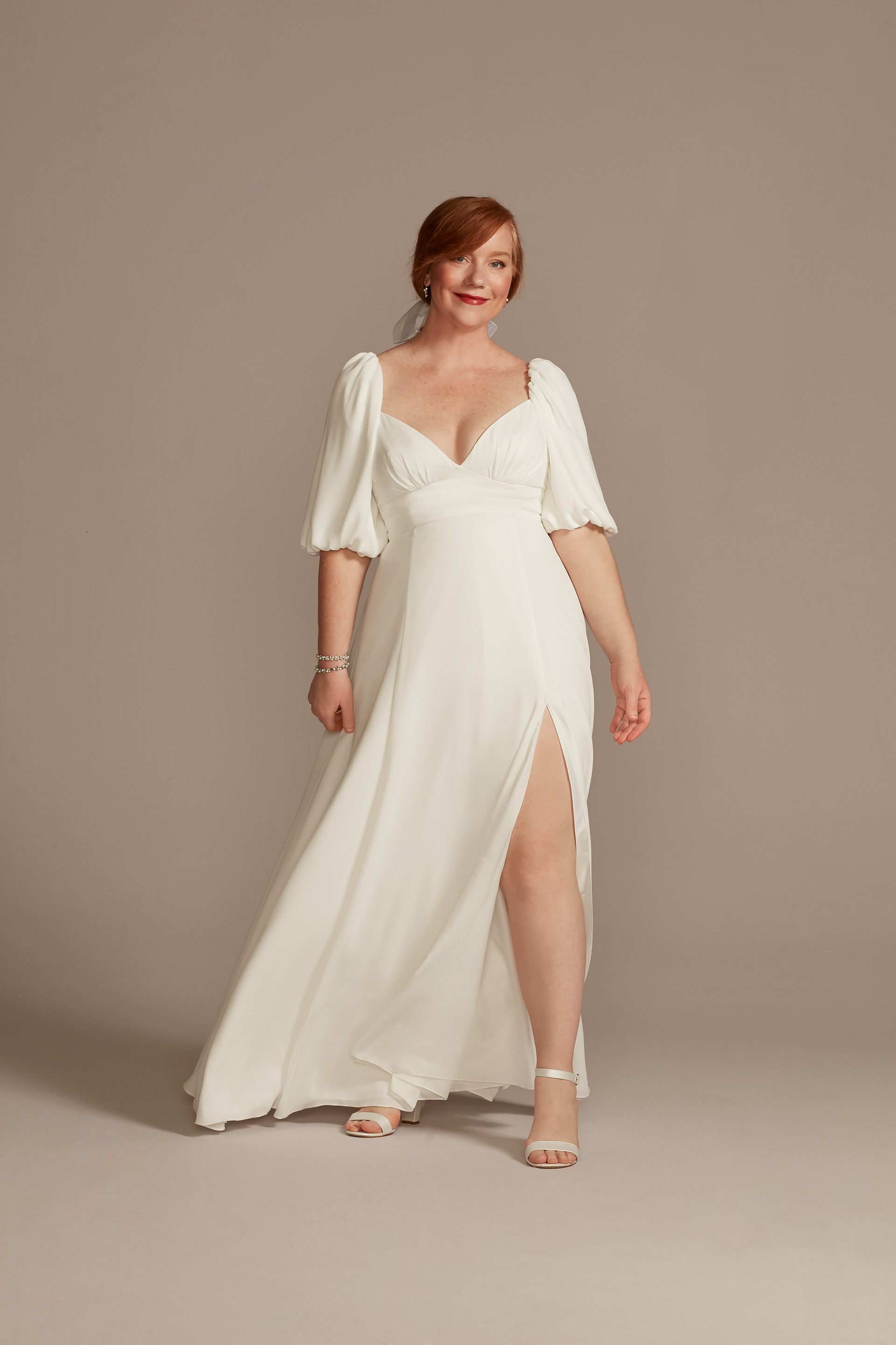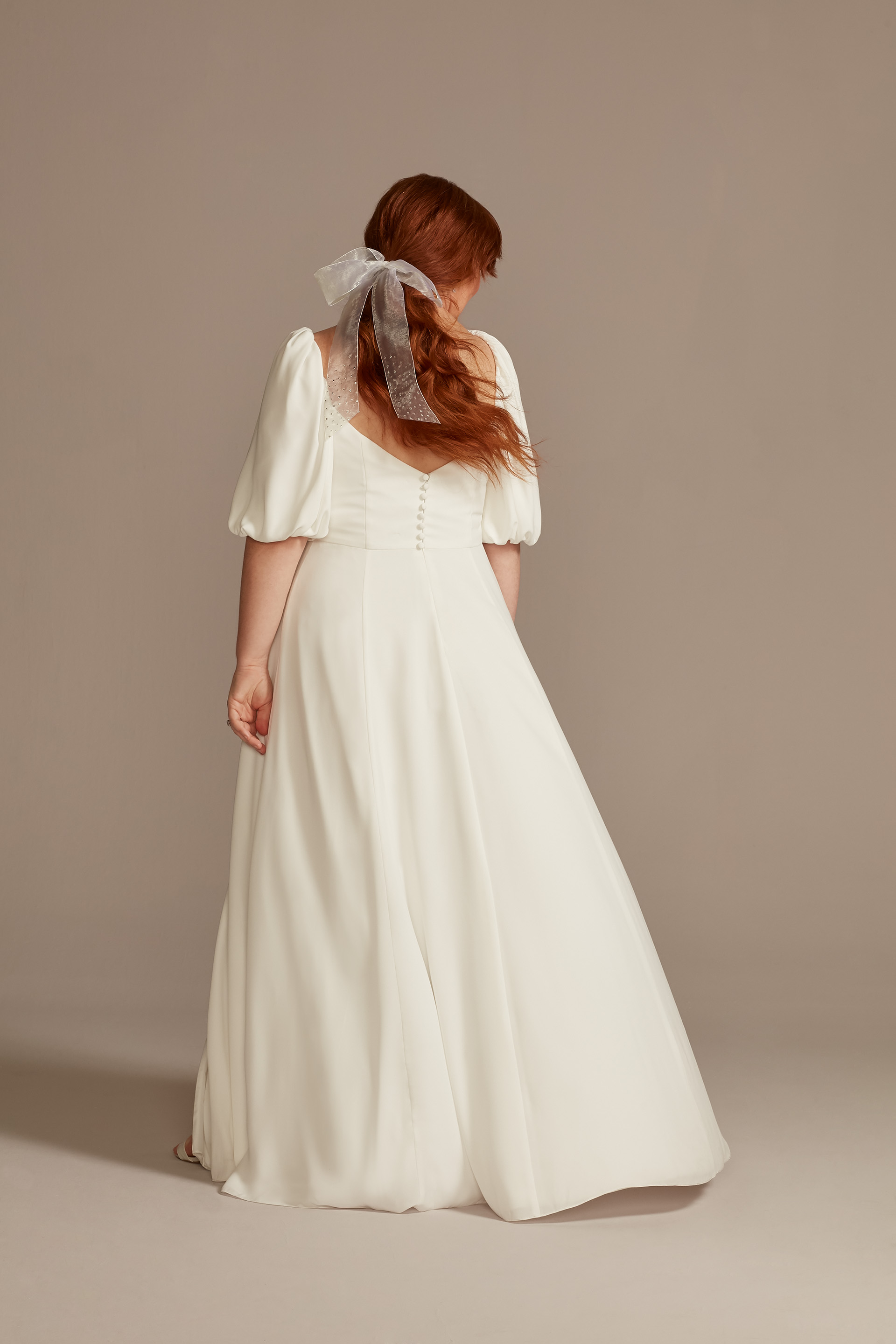 Whimsical meets romantic! We can’t get enough of this regency-era-inspired gown. From the elegant empire waist to the dreamy puff sleeves, we’re swooning over every inch of this photo-worthy style. Plus, can we take a second to admire the beautiful button-back detailing? For an extra sweet touch, we love the idea of adding a hair accessory like a bow or pearl headband. Shop this style here for only $249.95!
