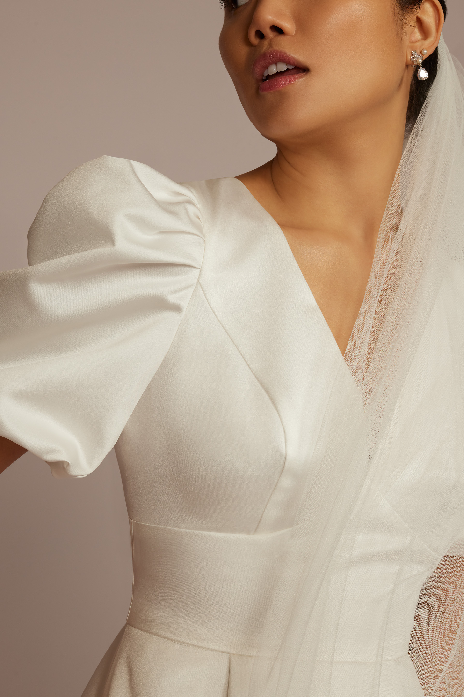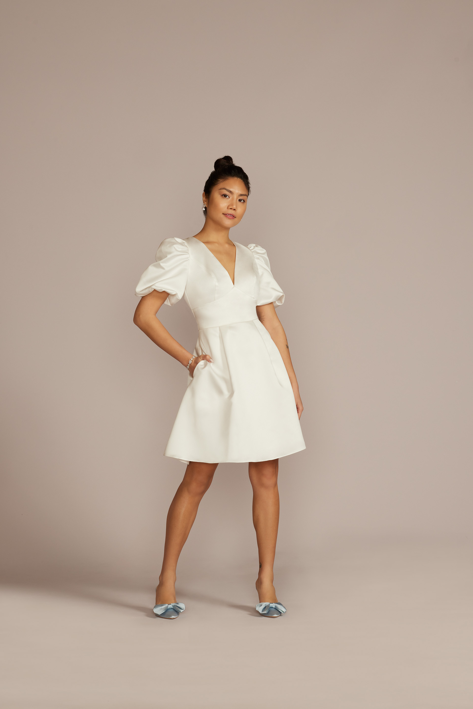 Short Satin Puff Sleeve Dress with Empire Waist