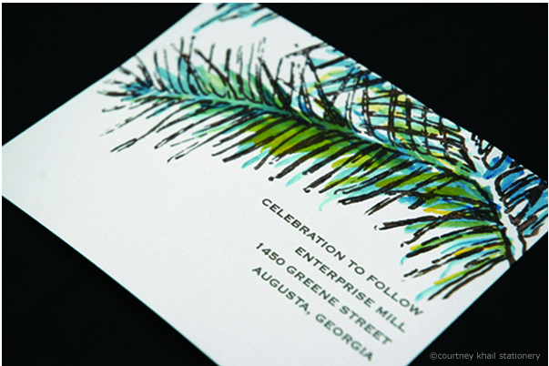 There are many different ways to create a unique wedding invitation but few have the personal touch of an actual hand painted design. I recently discovered Courtney Khail Stationary and fell in love with the hand painted one of a kind designs she creates. Here is a little info from Courtney on the design process “Whether it is a custom design or one choosen from the gallery, each piece is hand cut, hand painted, and hand stamped with original artwork by Courtney Khail onto beautiful 100% rag cotton paper. By hand painting each piece, it allows us to provide you with something truly individualized where no two pieces are ever exactly alike.” Here are a few of my favorites but be sure you check out her site for more images.