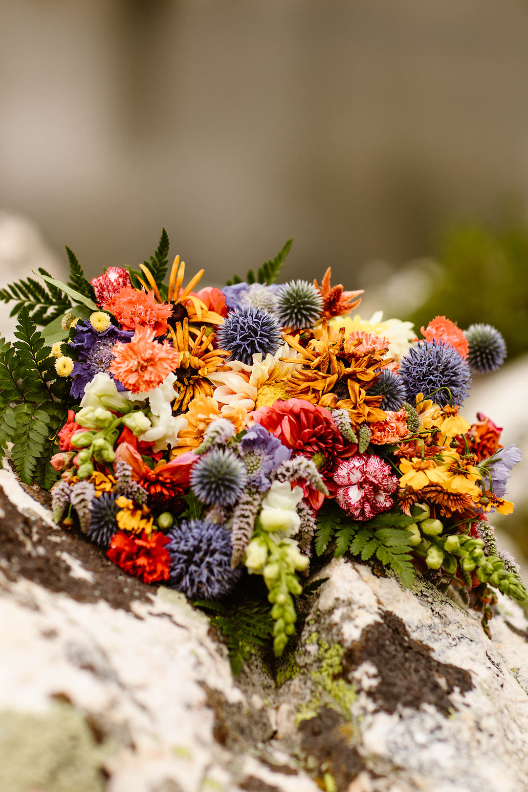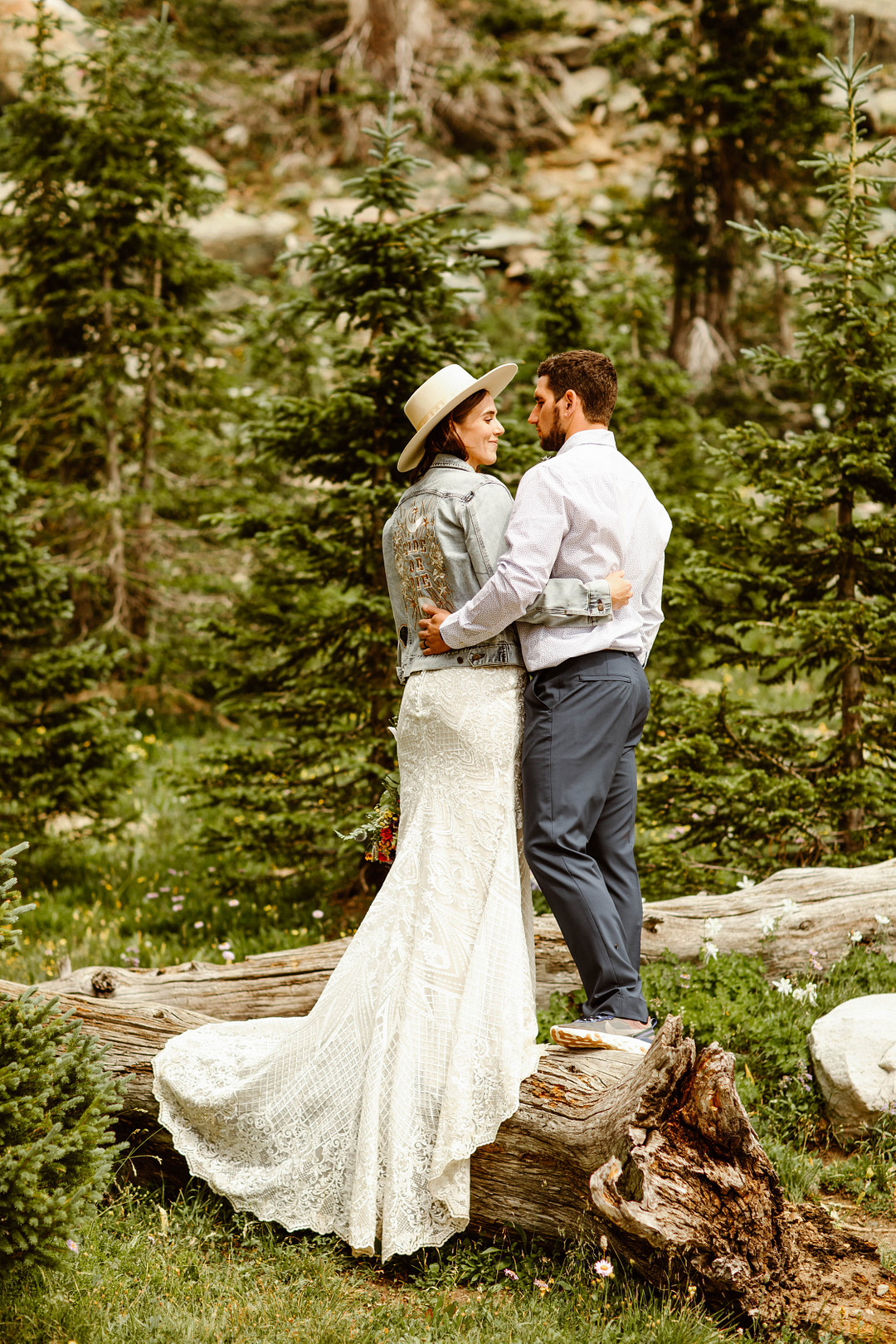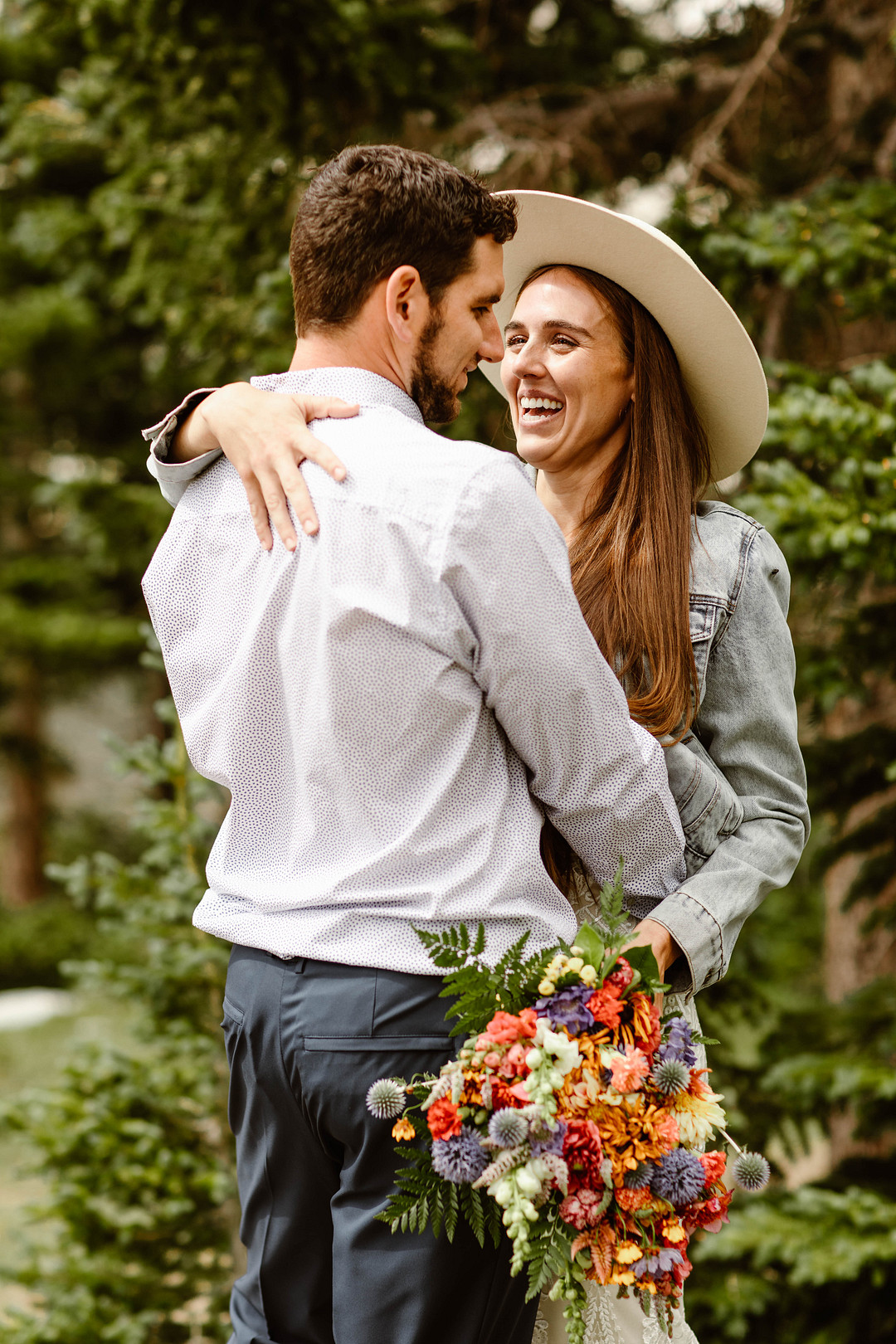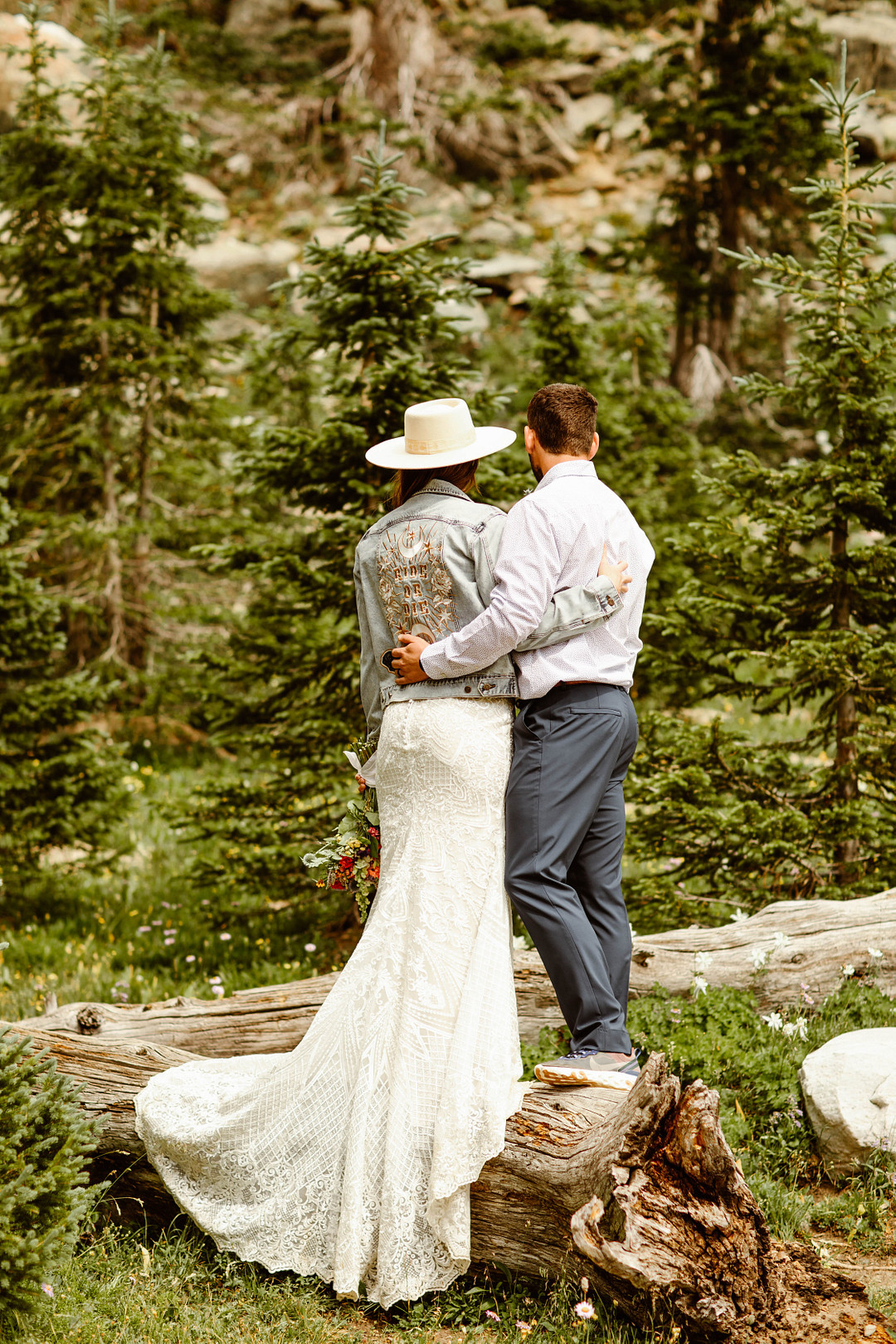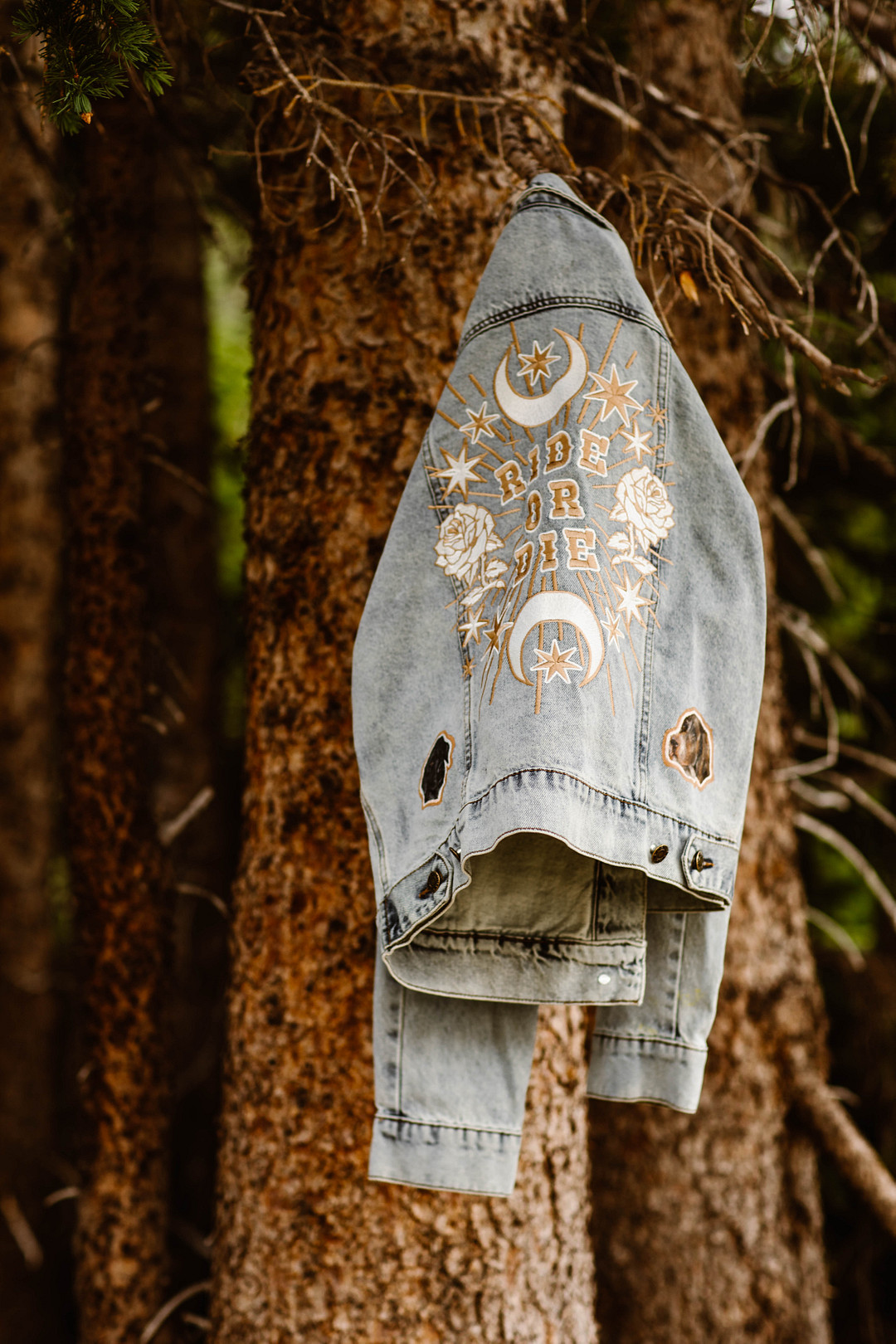 Katelin and Tyler wanted to infuse their personal style into their day, with western touches present throughout. Plume & Furrow crafted a wildflower bouquet for Katelin, with a colorful array of flowers that fit perfectly with the wild landscape of their elopement spot. Katelin opted to pair a denim jacket, from Rue de Seine, with her dress, with photos of both of her pups embroidered onto the back. Sheena Shahangian Photography LLC