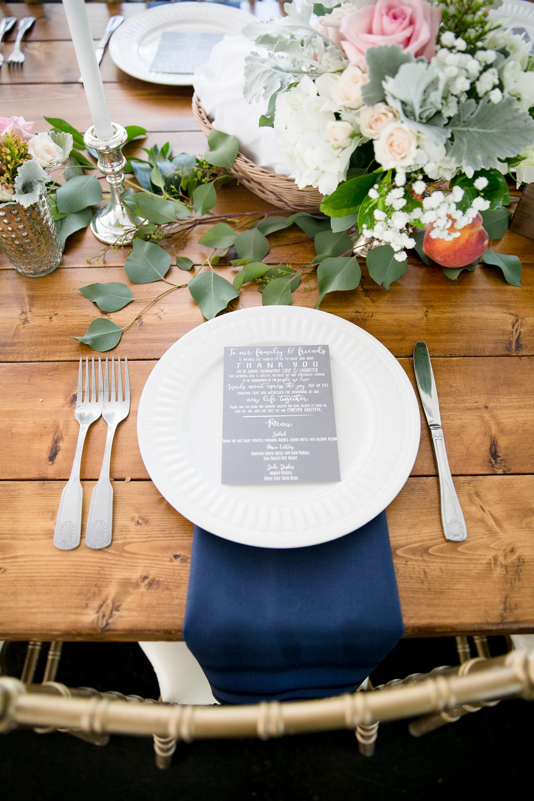 My color palette started with peach (Georgia is the peach state after all). From there I added neutrals to complement and navy to add contrast the light color scheme. With the rustic farm tables and tons of green space, including a pond, Little River Farms was the perfect setting to create the atmosphere and aesthetic that we wanted.