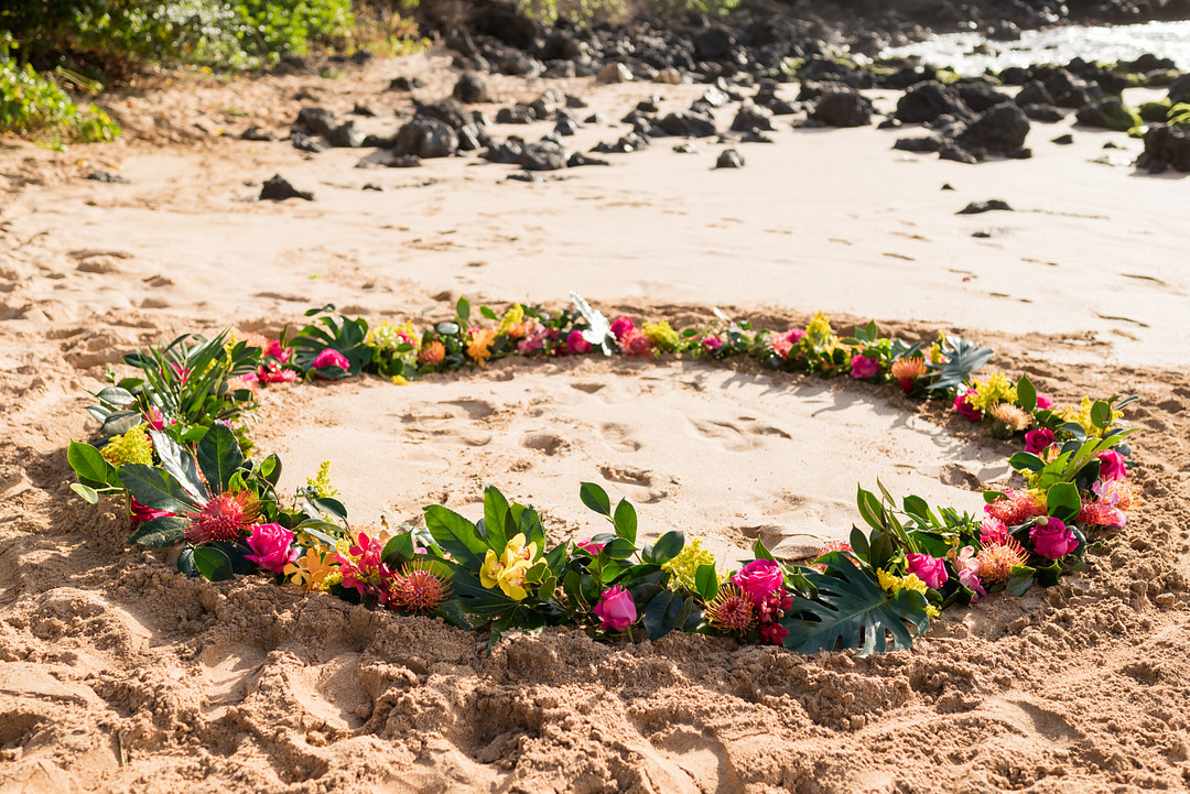 “Simple Maui Wedding arranged for talented local performers to set the scene with soft Hawaiian melodies and the sacred movements of the hula. In place of a ceremonial arch, Megan and Kat were encircled by island flowers draped on the sand as they said the big “I do.” -Karma Hill Photography