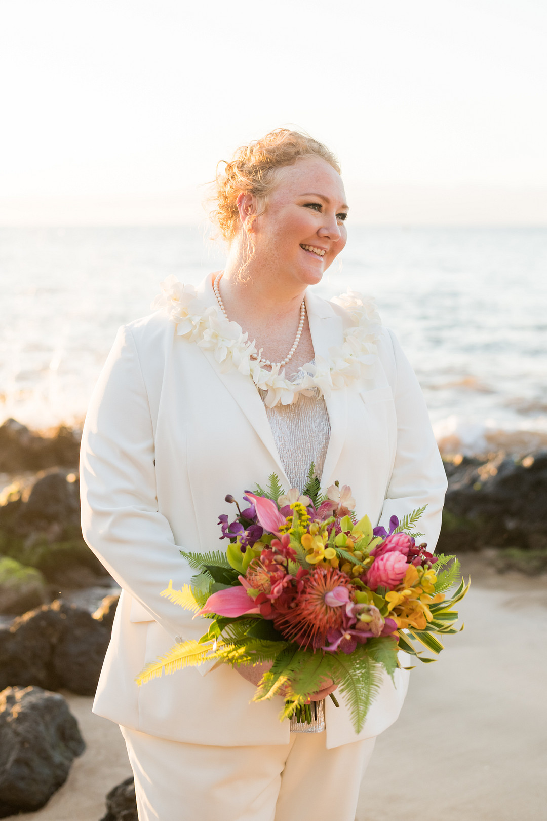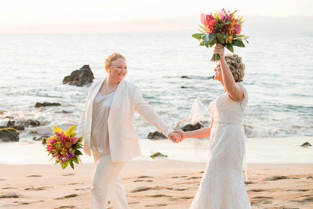 “Megan looked spunky and gorgeous in a curve-hugging lace gown with a sheer back. Accentuating her bride, Kat wore a cream suit with an open blazer and lace blouse. To tie it all together, both carried a rustic Hawaiian bouquet with ginger, protea, and Maui foliage. And shoes? Who needs ‘em on the beach?!” –Karma Hill Photography
