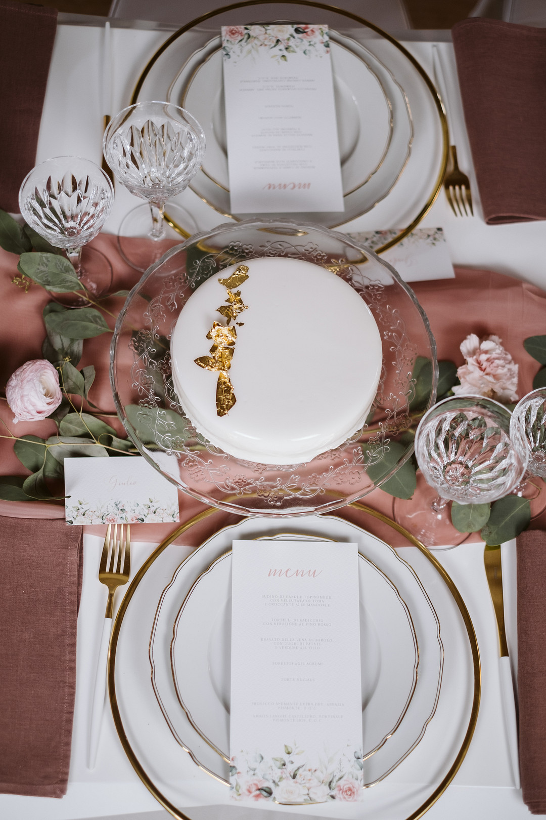 A simple white one tier cake with edible gold foil made for the perfect minimal wedding cake!