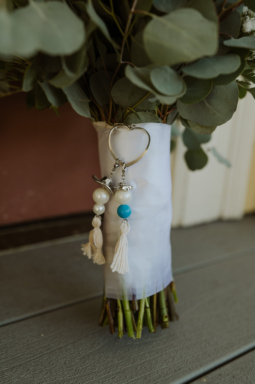“On my bouquet, I had a “todo mi amor” charm, which means all of my love. My family started a tradition where we would make a keychain or necklace out of beads and each bead represented a person we always want with us. My grandparents were not able to come to the wedding so my mom made me a “todo mi Amor” for them to put all their love into. Even though they were not able to be present it still felt like they were there!” – Tabitha