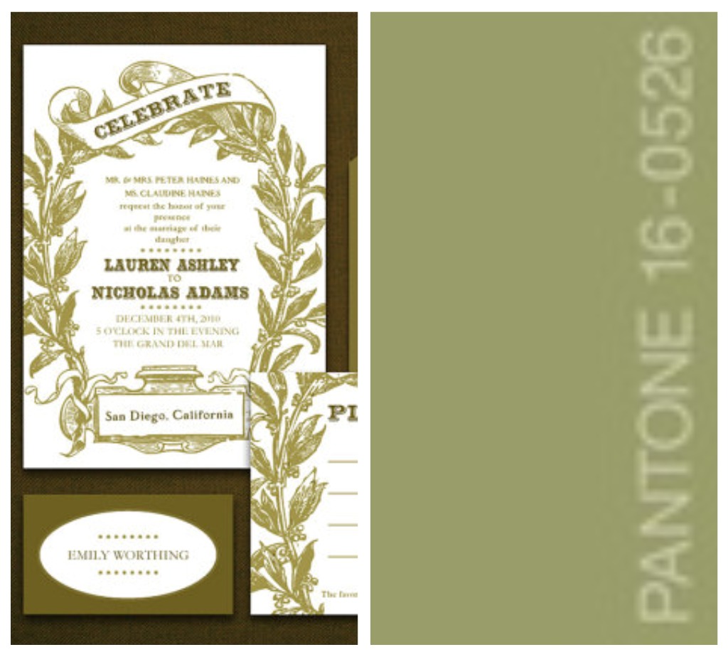 credits – color chart: Pantone / glass centerpiece: Kristyn Hogan Photography / dress: Macy’s / burlap votive: Whispering Pines Catalog / invitation: Benign Objects