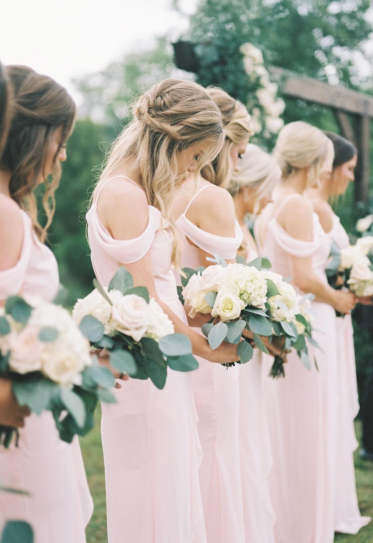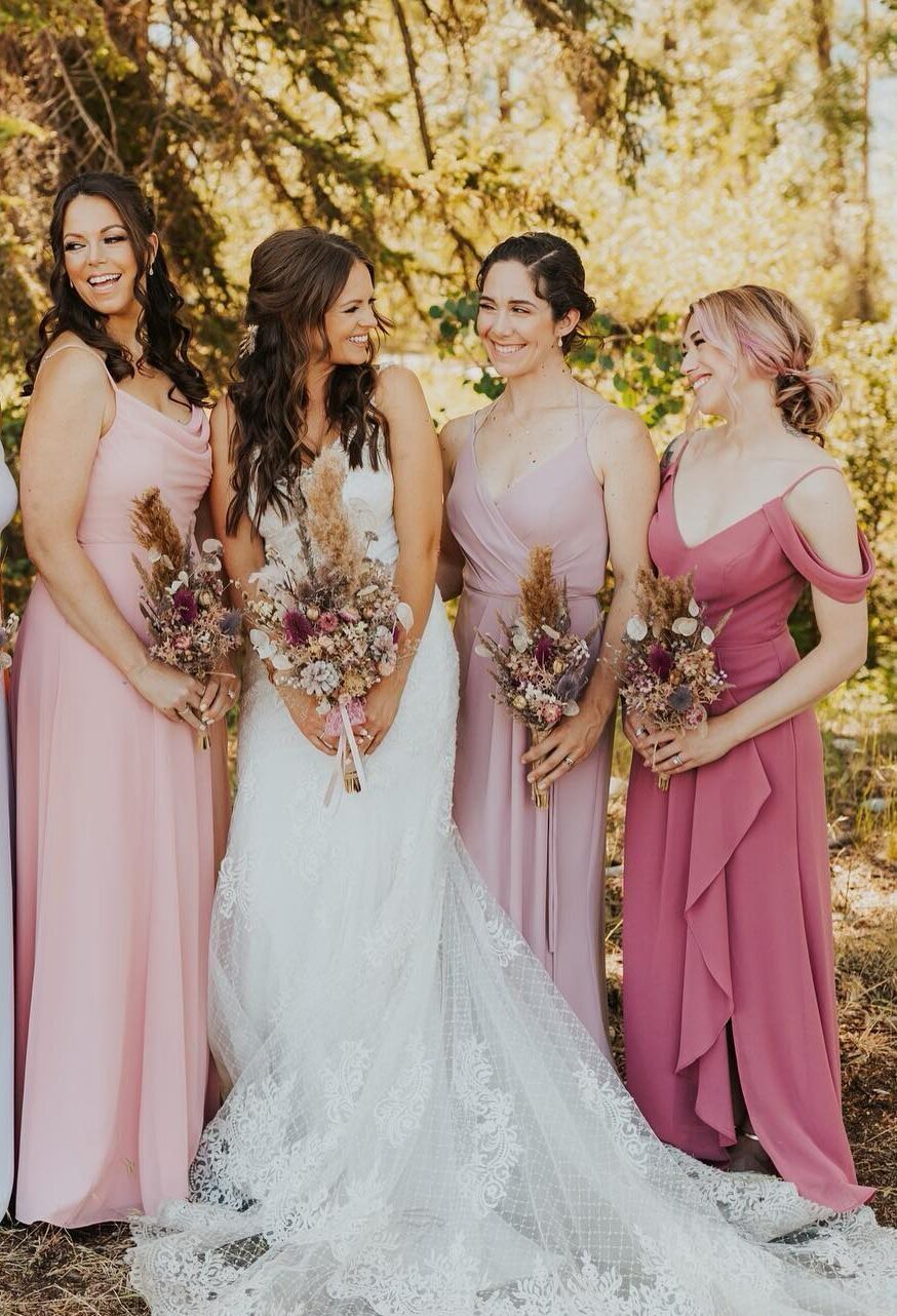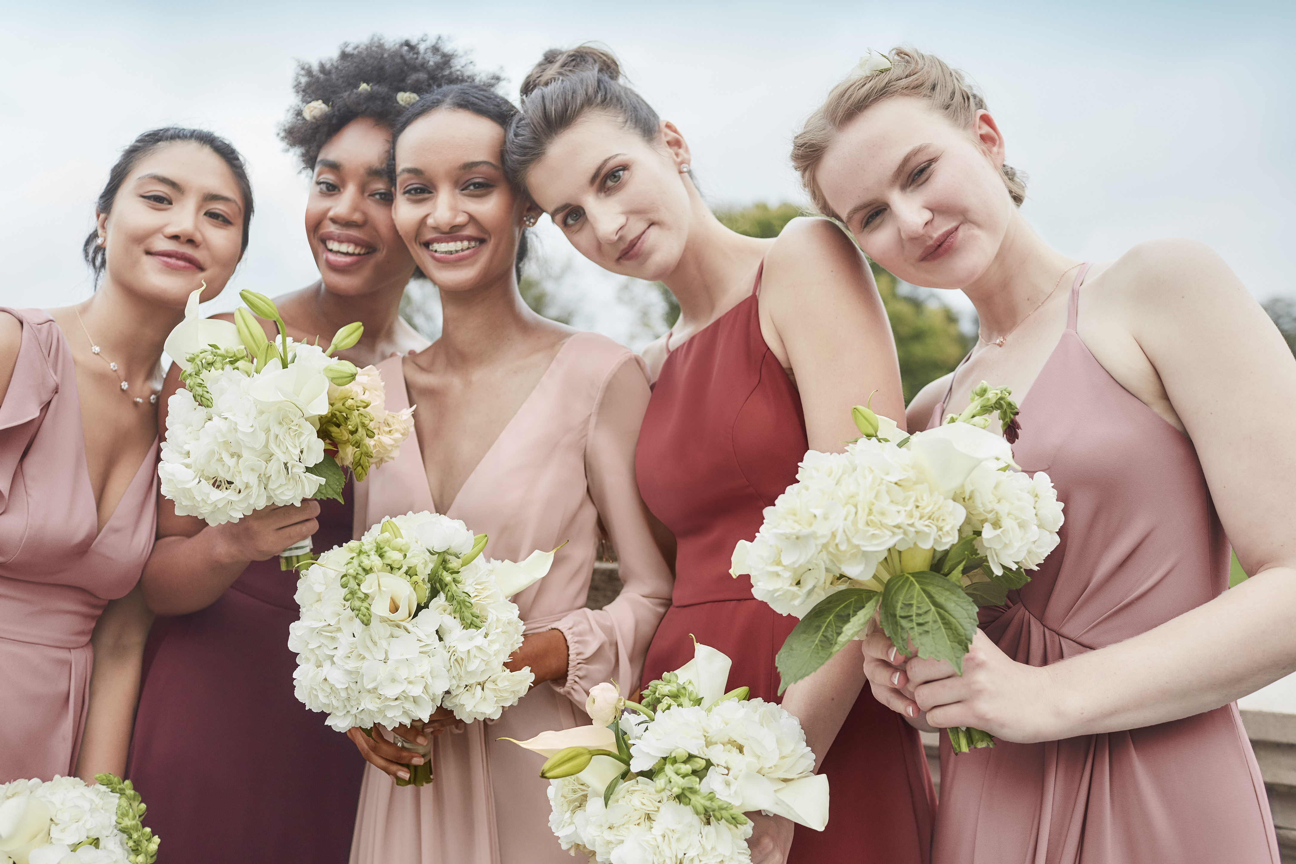 What pairs well with pink? More pink! We can’t think of a better way to incorporate this chic wedding color than an all-pink bridal party. Mix and match your favorite pink bridesmaid dresses with shades like Dusty Pink, Quartz and Chianti for a trendy yet classic bridal party look.