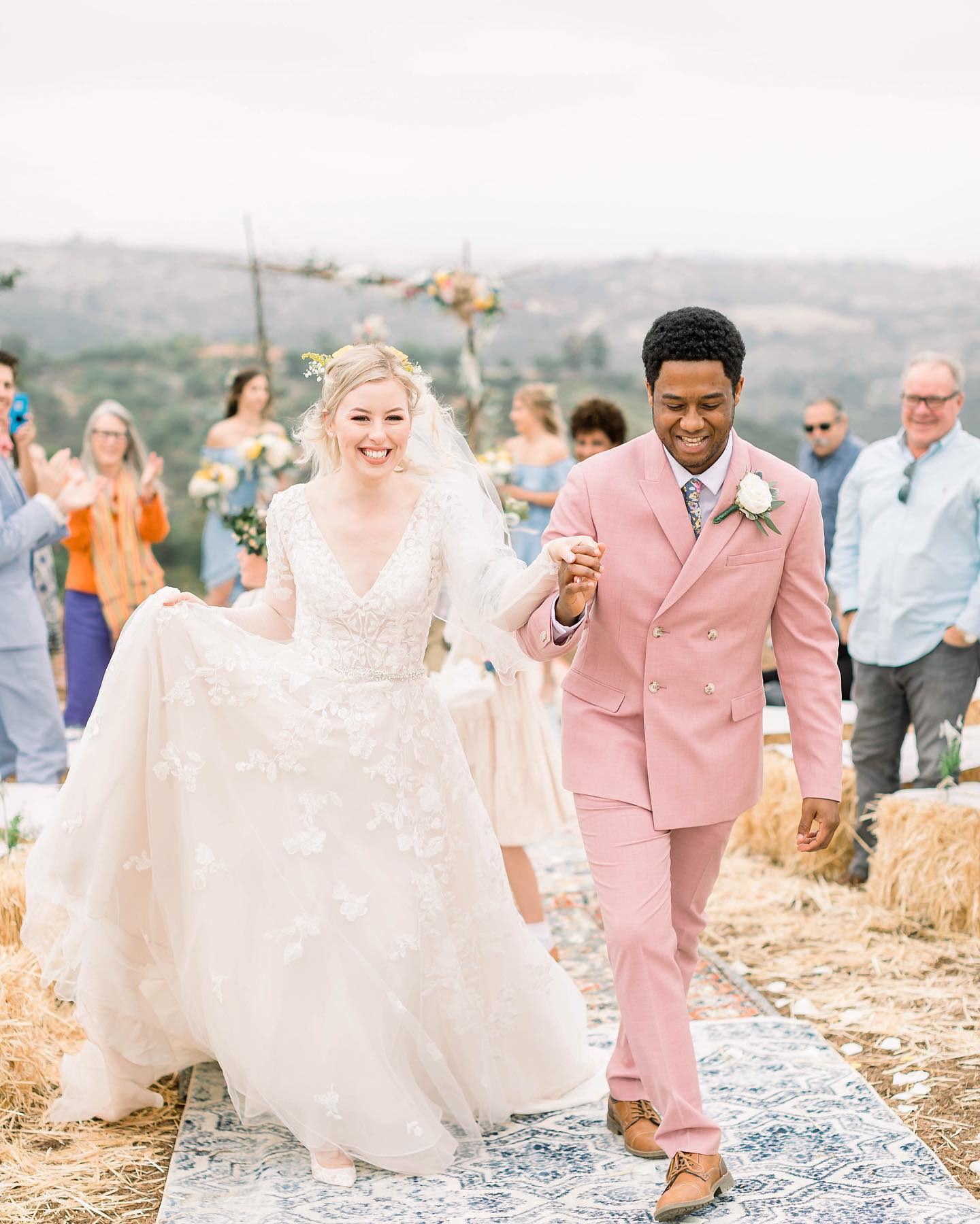 Calling all blushing brides! For a modern take on the traditional bridal gown, try a blush wedding dress. Want to incorporate even more pink? Have the groom sport a pink tie or tux to complement and complete your look. For a more subtle addition of pink, a floral boutonnière can add the perfect pop of color.