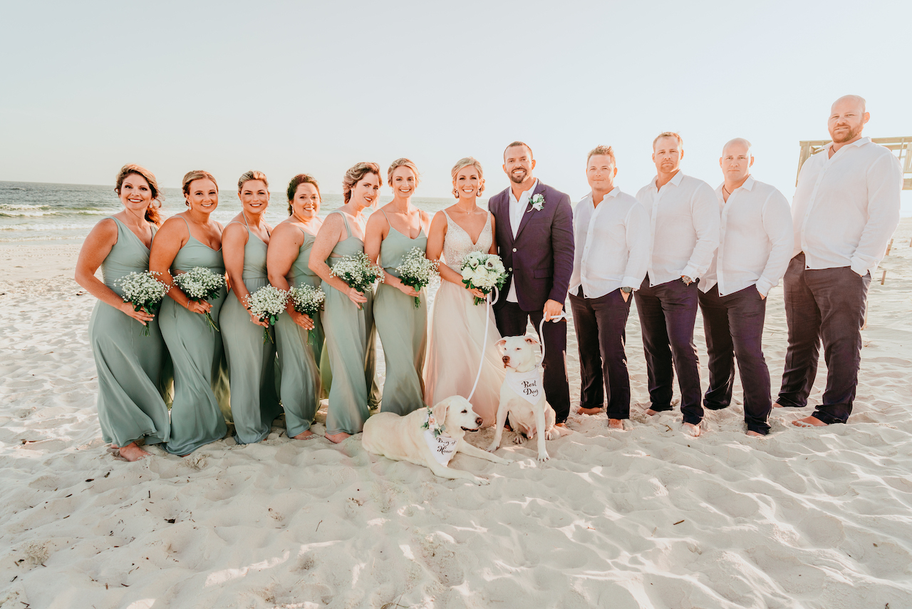 ” Our wedding day was the best day of my life thus far. It was absolutely perfect. We rented a large beach house in Gulf Shores, Alabama. We wanted it to be intimate, so we had our siblings and their children, parents, groomsmen and bridesmaids as guests. My favorite part was that our beloved dogs were also part of the wedding, as Dog of Honor and Best Dog.” — @acraft_11