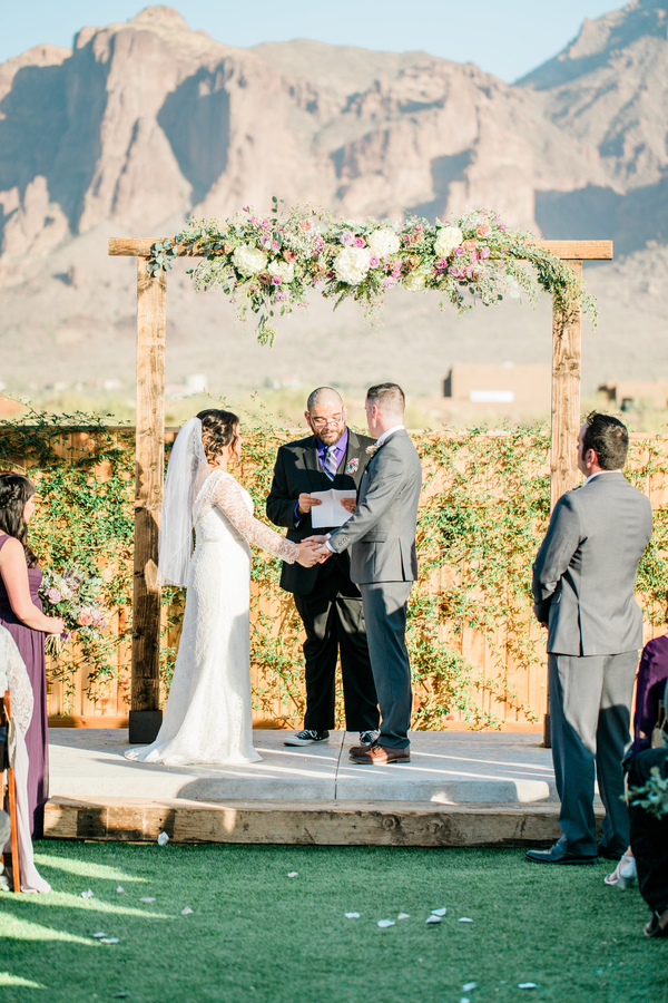 Taking place at a super rustic Arizona wedding venue called The Paseo, this wedding is just fantastic. From the elegant flowers to the picturesque desert backdrop we can’t get enough of this vintage chic wedding. From the photographer: Alyssa and Nathan’s wedding day came together perfectly because their family and friends couldn’t wait to see these two tie the knot. The Paseo in Apache Junction, AZ, is one of our absolute all-time favorite venues to work with. The grounds are incredible, with million dollar views of the Superstition Mountains, and the people are just as valuable. Thanks to Dan & Erin PhotoCinema for sharing this stunning wedding with us today.