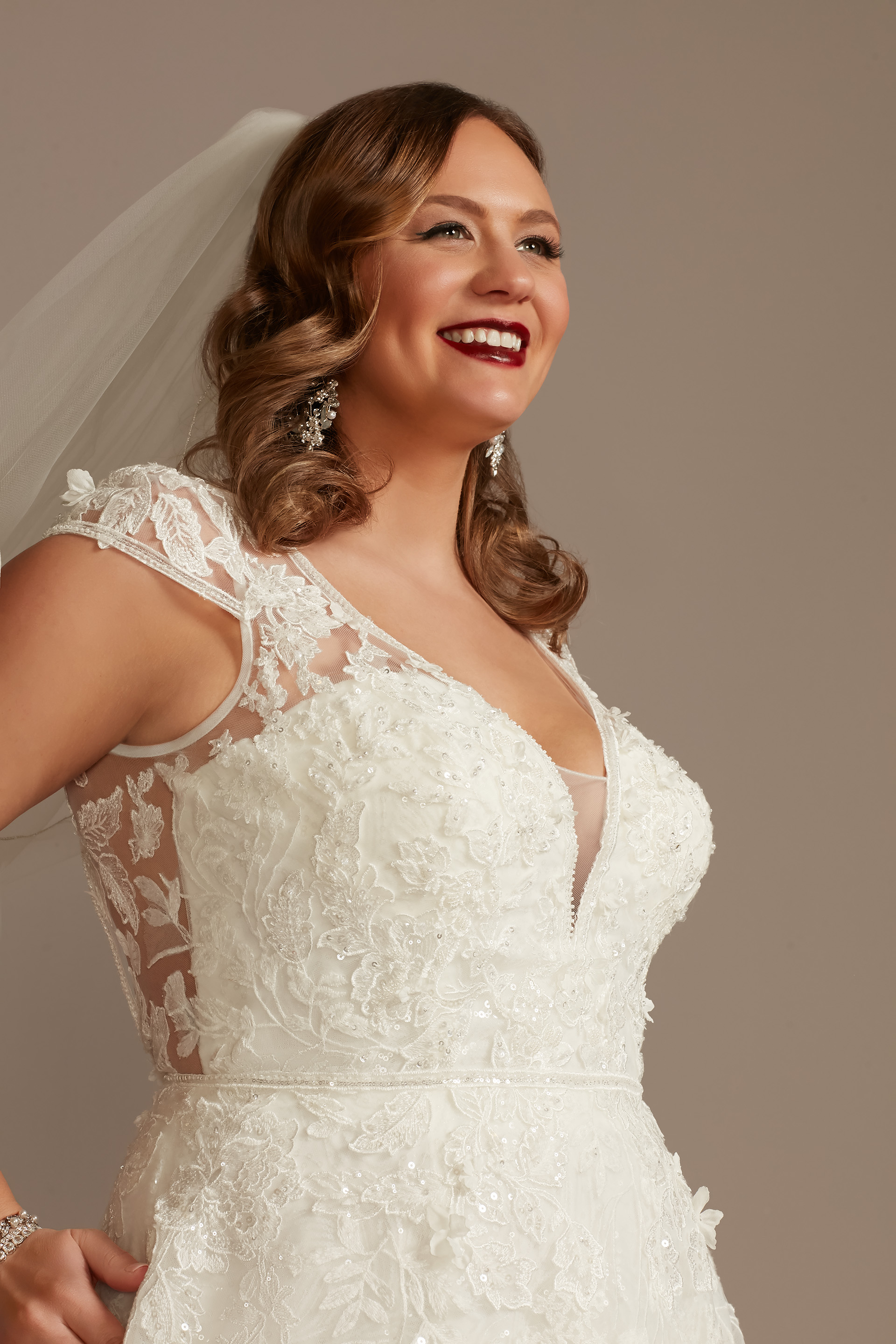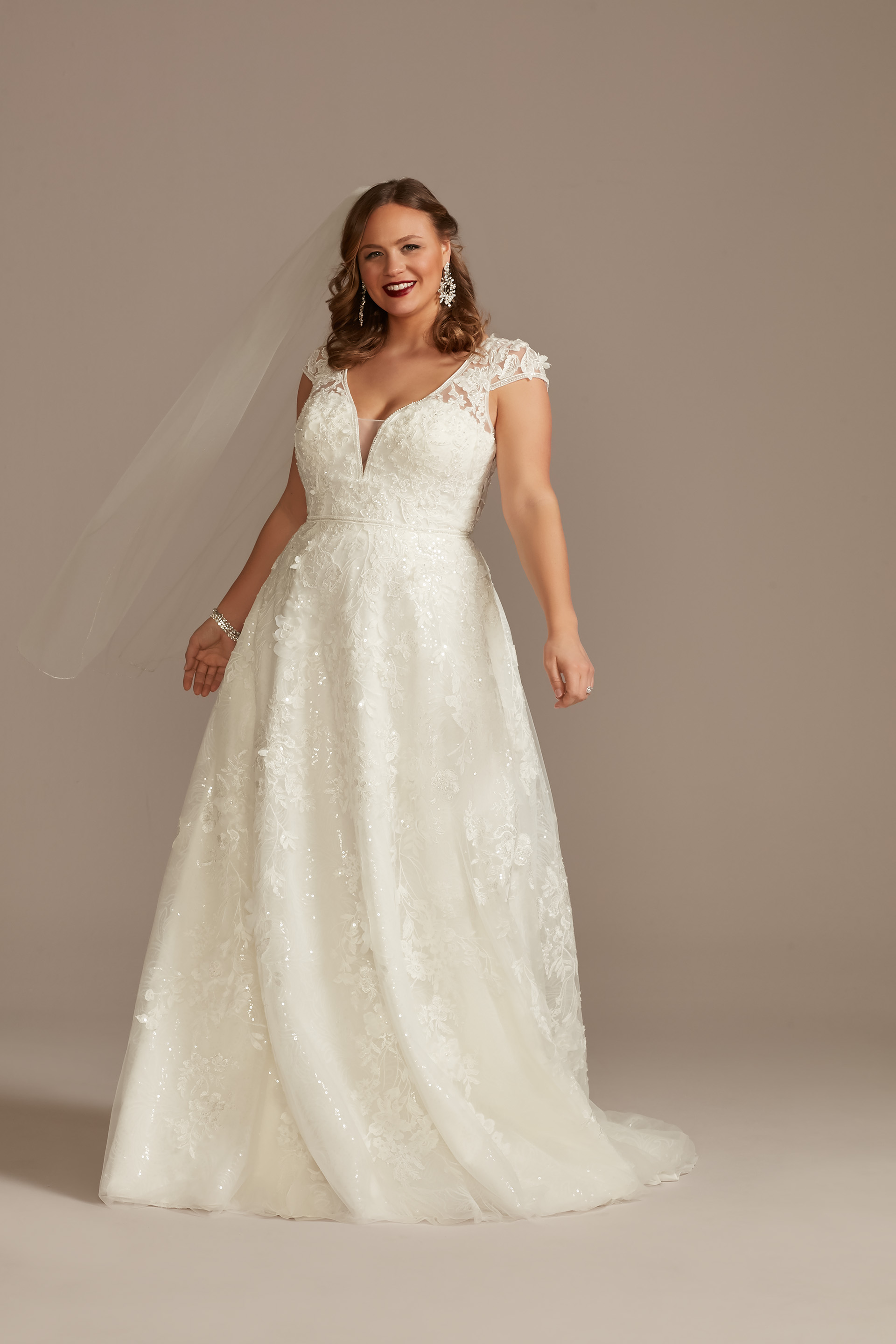 Modern meets traditional with this opulent wedding dress. From the cap sleeves all the way down the train, this style is covered with breathtaking sequins, beading, and floral appliques. Shop this style here for $1,599!