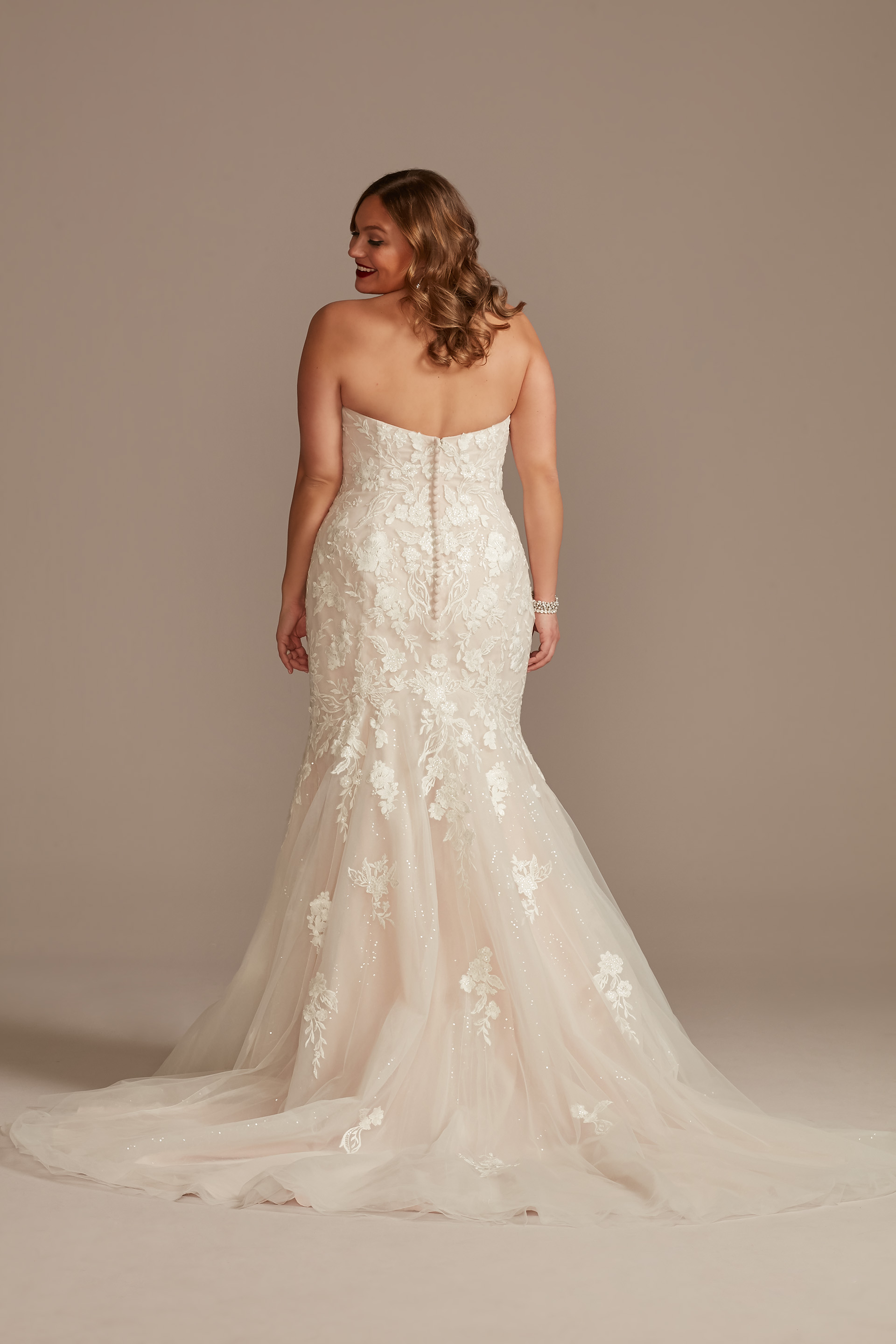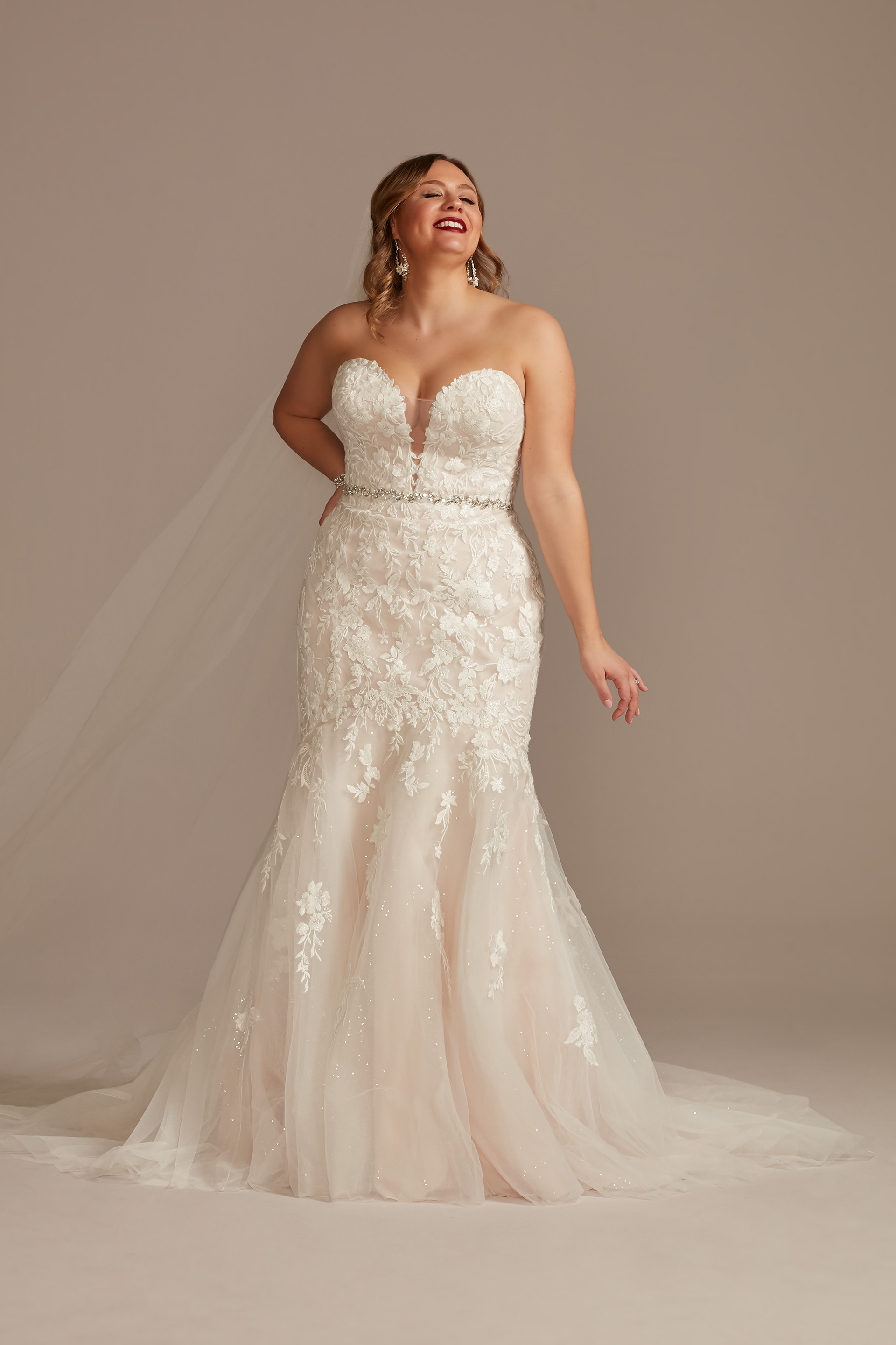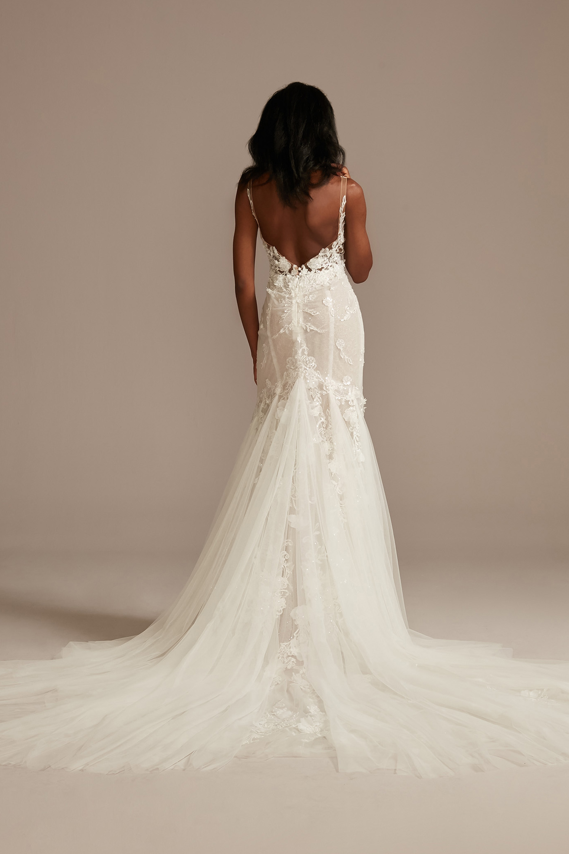 Figure flattering and covered with delicate details, this mermaid silhouette is adorned with beautiful floral and vine appliques that trail down the length of the gown. The soft tulle skirt adds dreamy movement as you walk down the aisle. Shop it here for only $999!