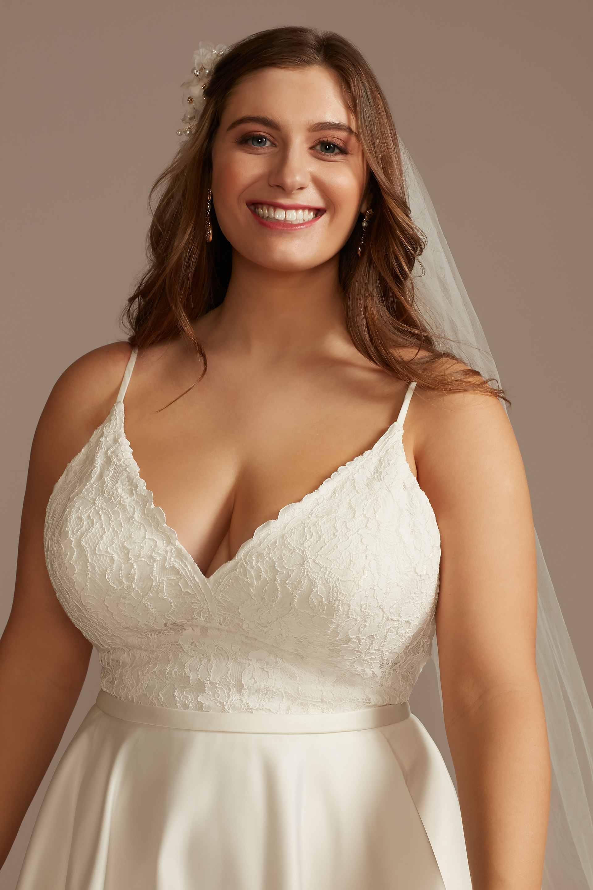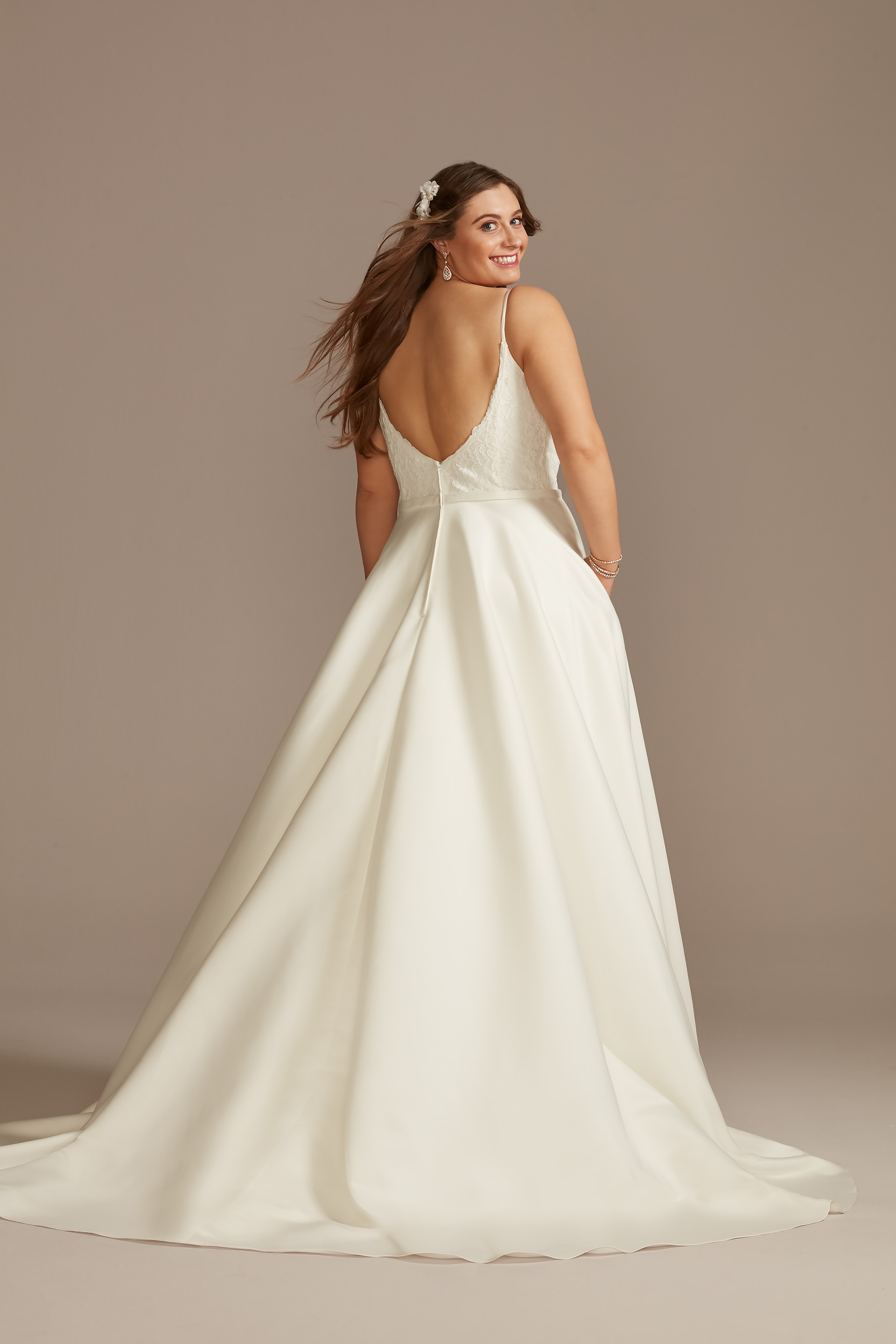 Satin & lace? Name a better duo! This romantic style is ideal for an outdoor fall wedding. From the sweet lace to the chic satin skirt, we love every inch of this gown. Shop it here for only $699!