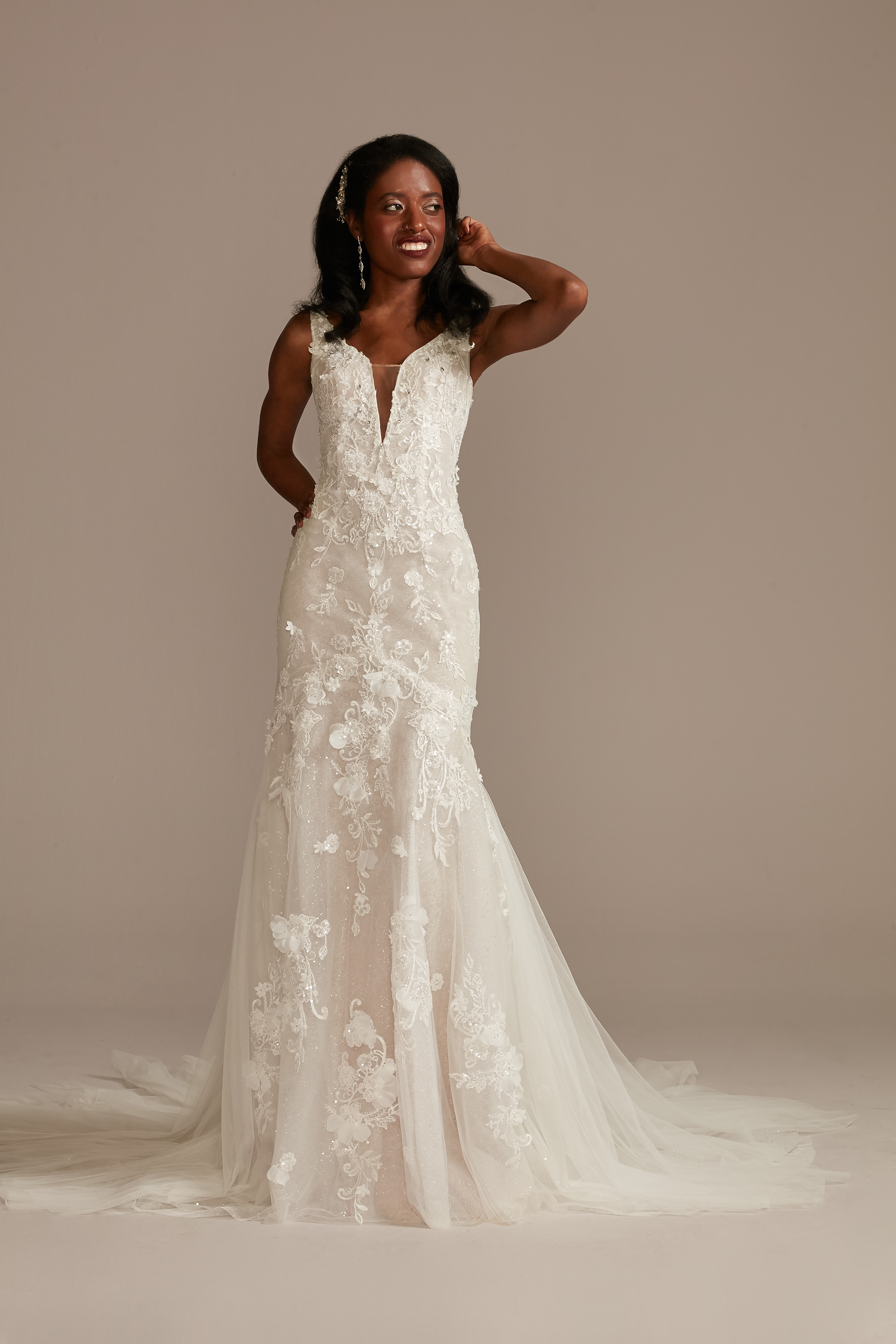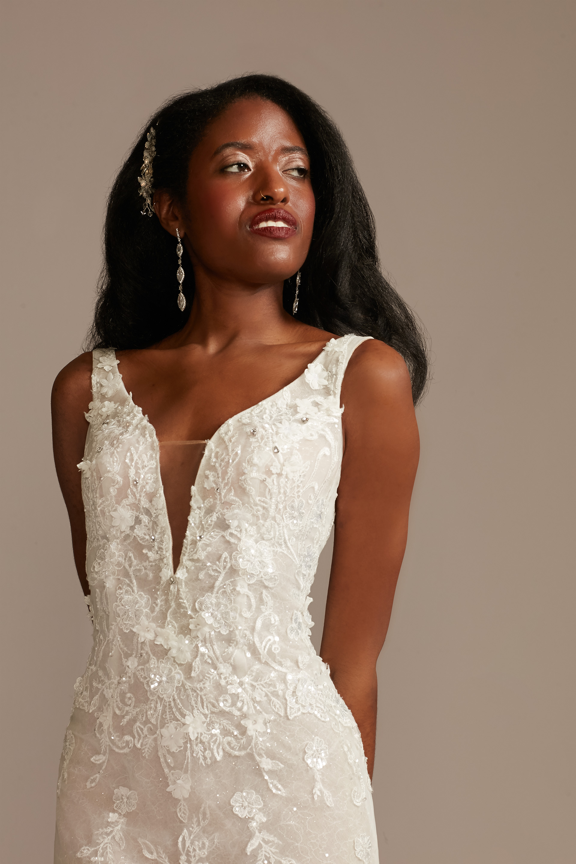Made with glitter fabric and dazzling floral beading & appliques, this dress is guaranteed to shine under the twinkly lights at your venue. A plunging neckline and low back give an alluring touch to this romantic wedding dress. Shop it here for only $1,499!