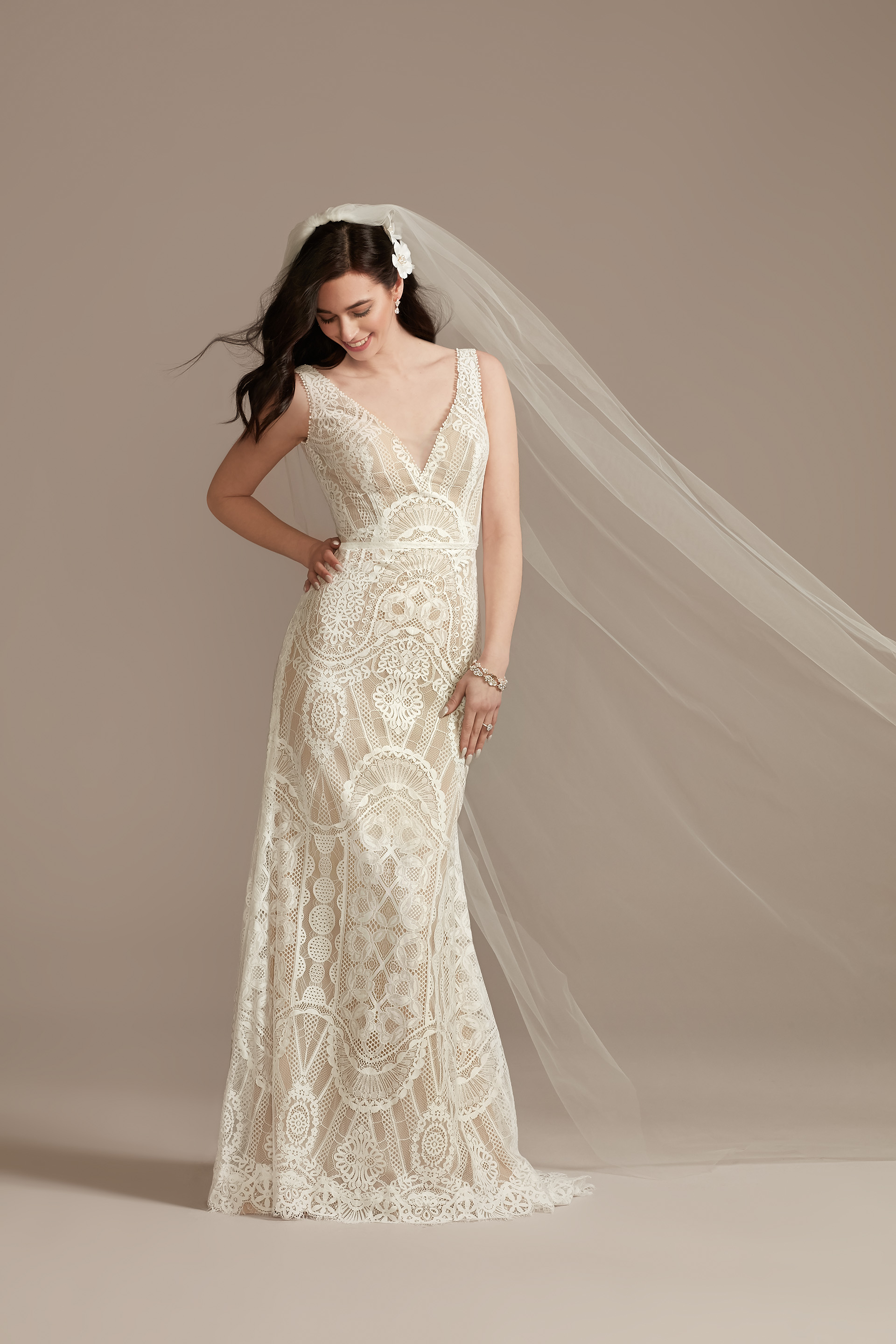 This gown is perfect for a fall bohemian wedding! We love the hand-placed geometric lace on this gown, which complements all body types. Shop it here for only $499!