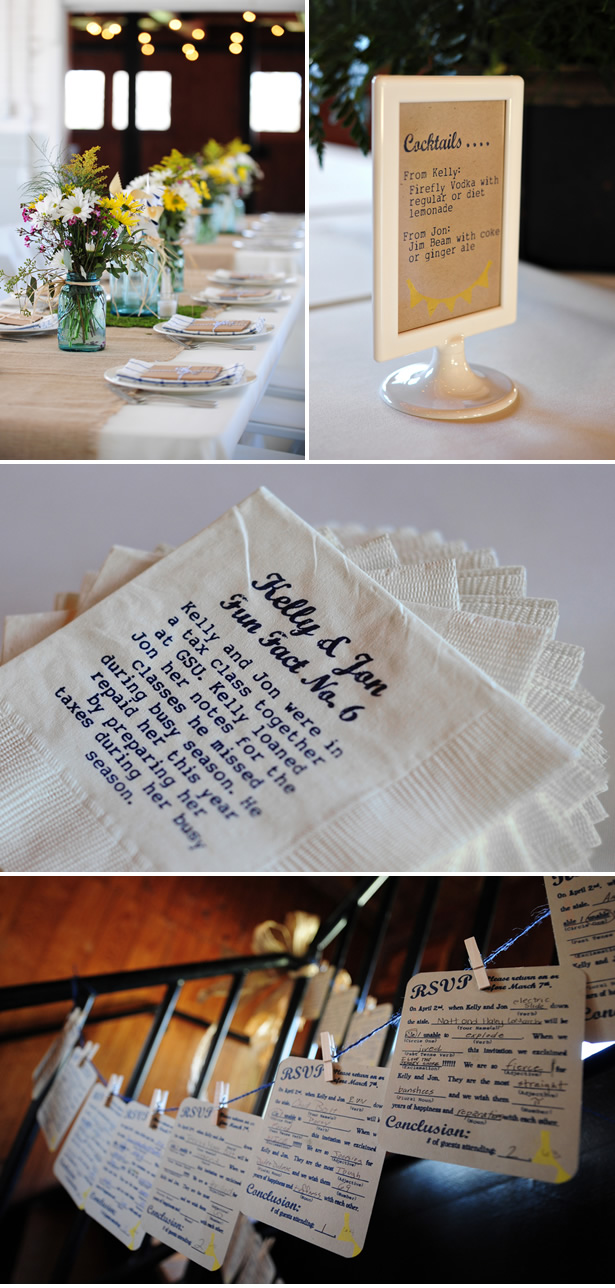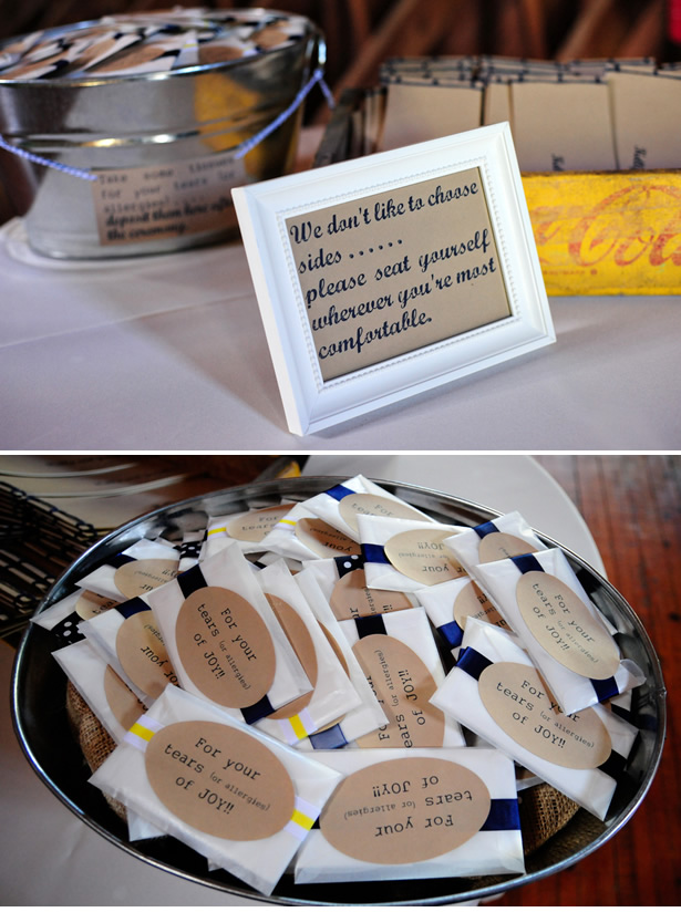 Burlap table runners, mason jar vases and chalkboard signs are just a few of the details that made this wedding stand out. This southern country wedding took place at The Dairy Barn in Fort Mill, SC and is filled with sweet southern charm. How fun are the pinwheel place cards- what a great DIY idea! Also, chalkboards are wonderful for welcoming guests and directing folks to the right place. If you’re thinking of using chalkboards check out the Rustic Wedding Chic chalkboard collection.