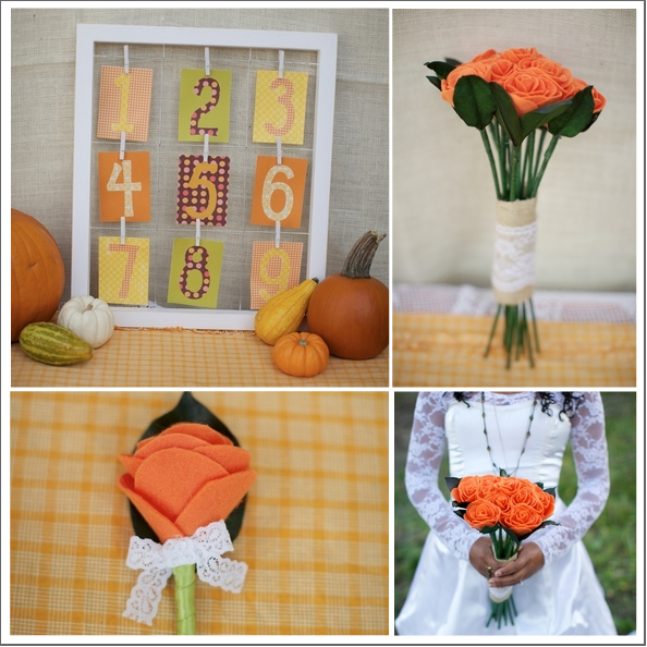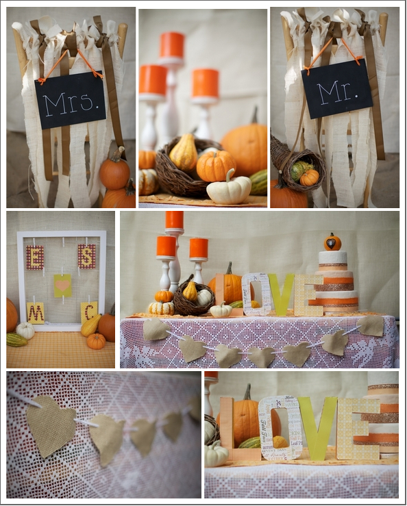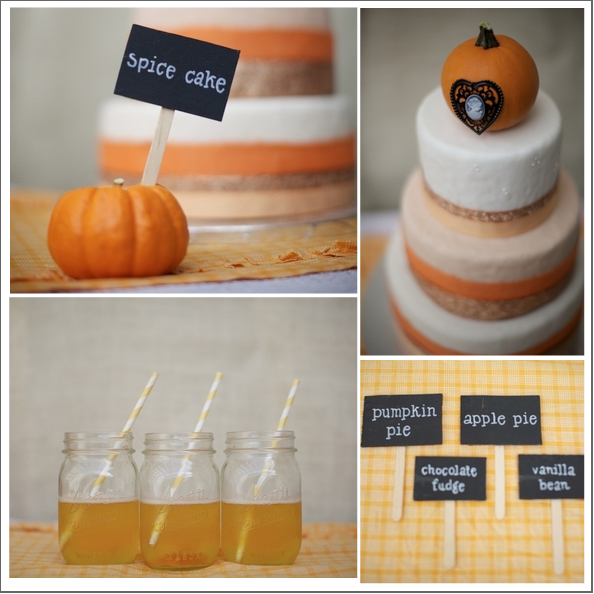 The fall season brings nice crisp evenings, warm apple cider and a spectacular new color pallet to work with. Here is a very colorful and perfectly fall centric inspiration that shows off some of the best ideas for a rustic fall wedding. I love the idea of bring the traditional orange color into such wedding details as the cake and place settings. Adding a touch of yellow or light brown may also be a way to bring the entire fall color spectrum into your wedding. The idea of bring in pumpkins is a surefire way to say fall but think about bringing in other gourds to fill out the decor and add to the color range.