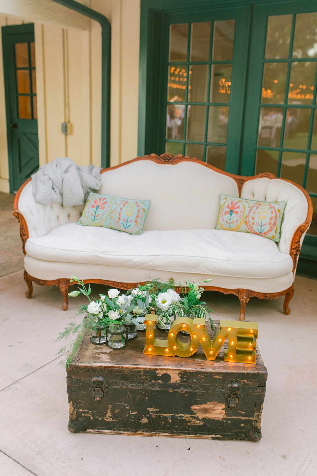 Courtney explained “We really wanted our guests to feel almost as if they had been transported to a far off destination for our wedding. I think that we achieved the style and vibe that we were going for by incorporating vintage furniture, lots of lights strung and hung from the trees, wood tables, and soft flowers and greenery throughout.”