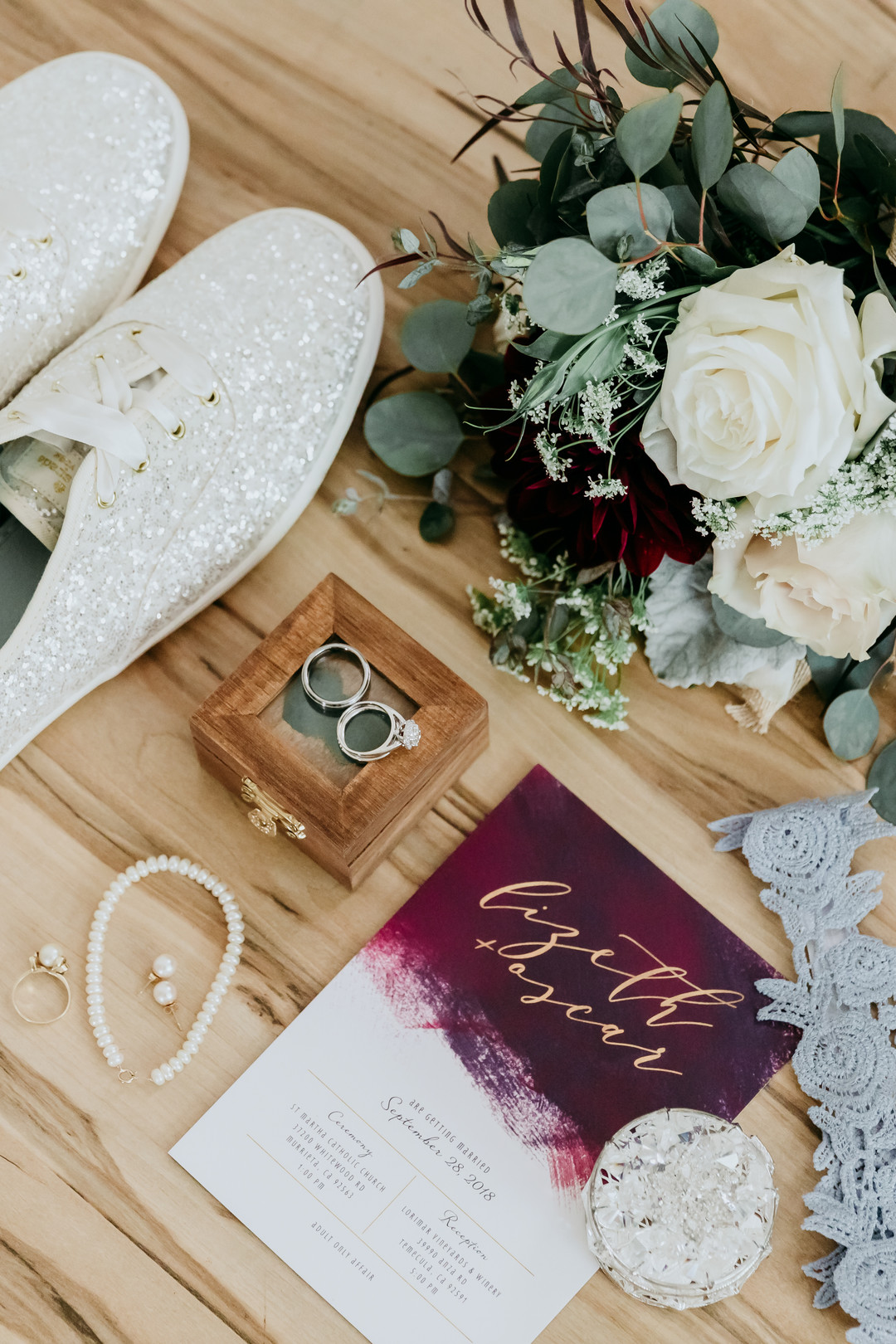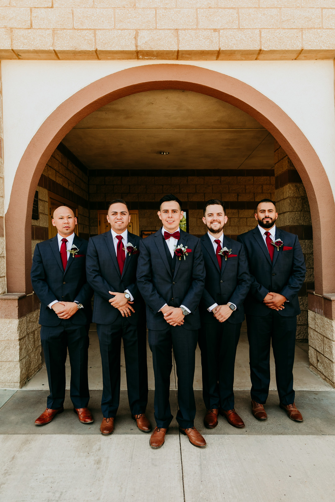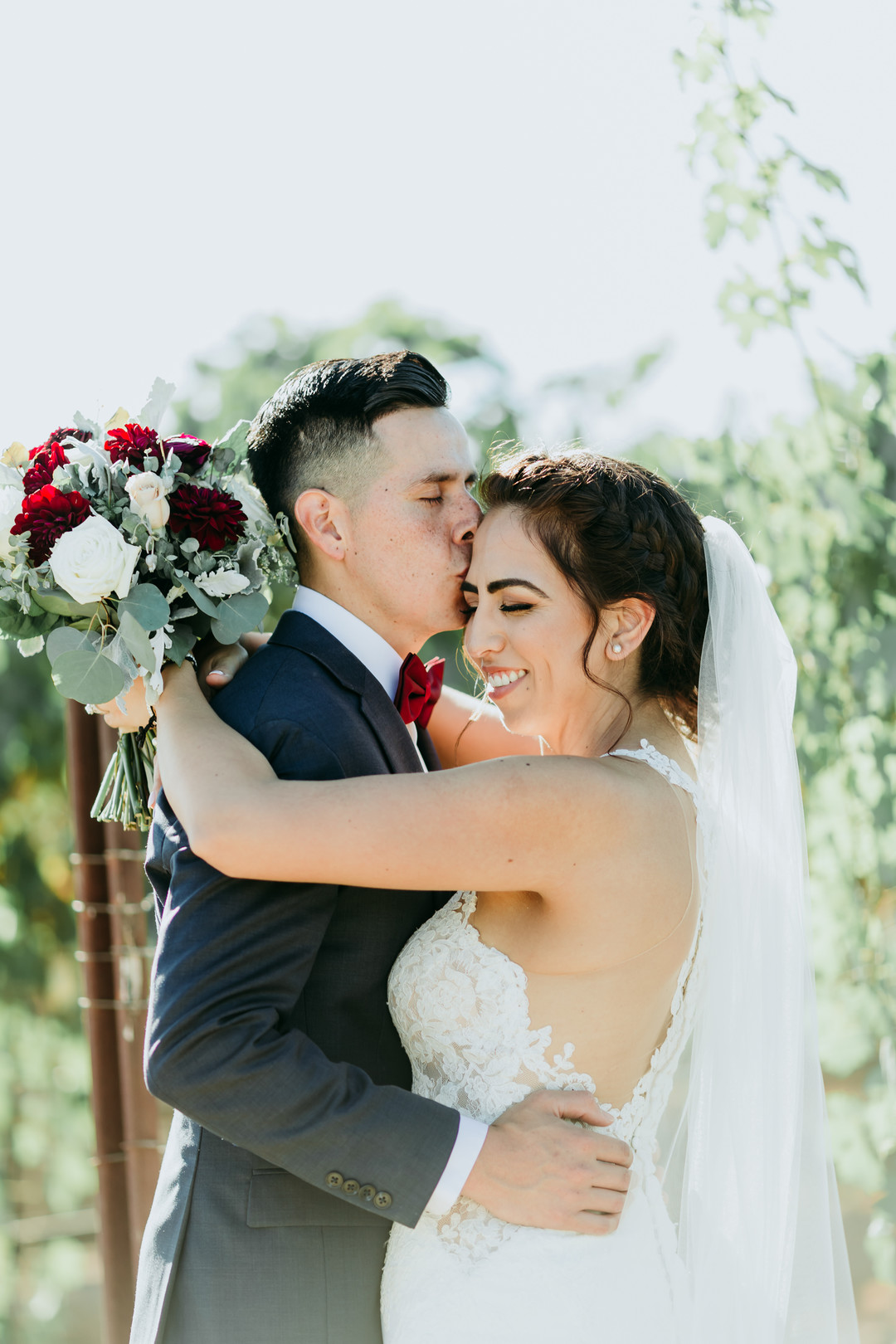 The ceremony took place at the beautiful St. Martha Church and was an elegant backdrop for their vows. I love how well they balanced their formal theme with the rustic atmosphere of the reception venue at Lorimar Winery. The bridesmaids’ crimson dresses and groomsmen’s dark blue suits really stood out against the natural background of the vineyard and wood details of the barn and wine barrels. The design was flawless. The Lorimar Winery in Temecula, CA lends itself well to gorgeous portraits as the huge open sky spreads wide behind rows of grape vines.