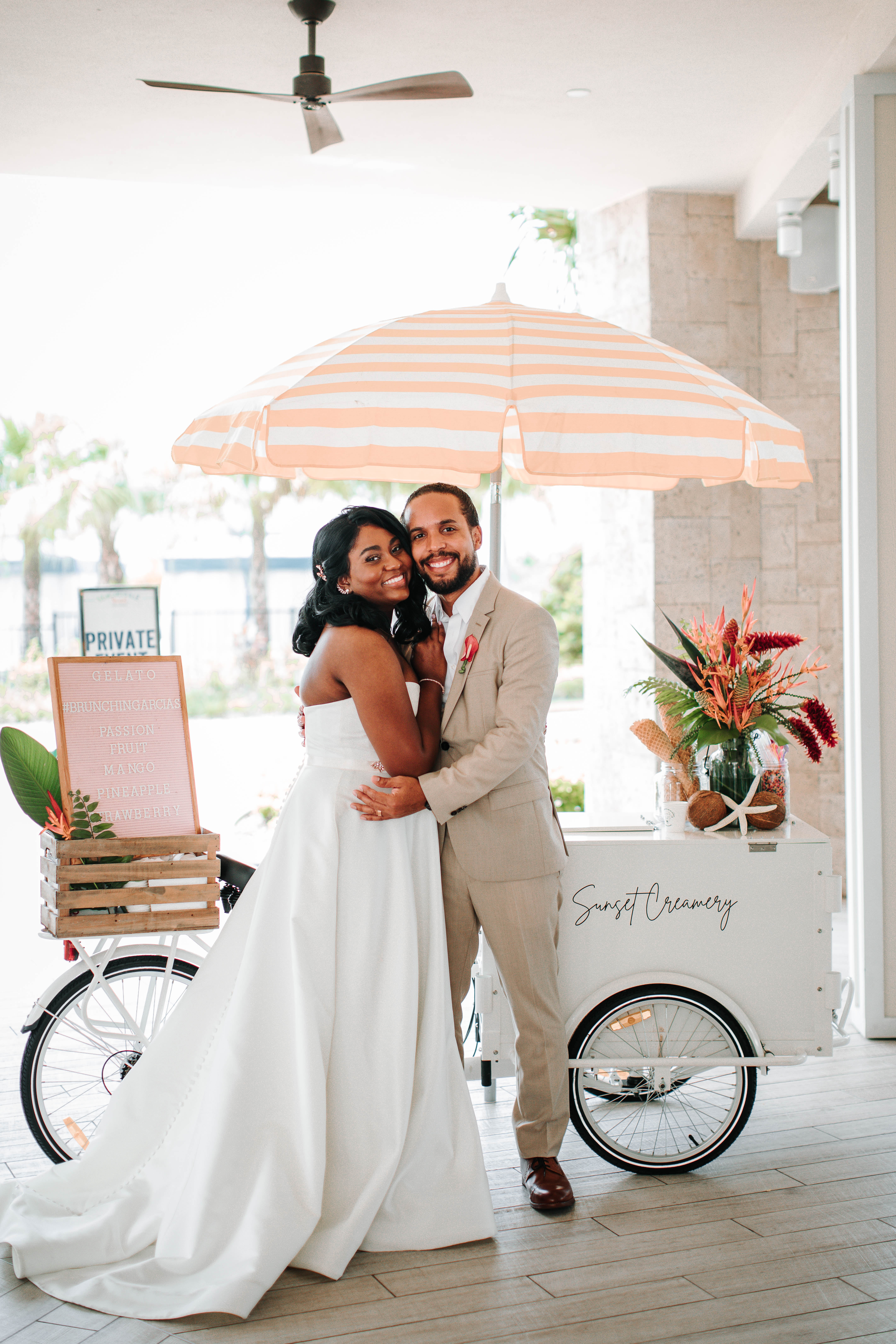 “Our reception afterward was energetic and engaging. Because it was a brunch wedding, we had a mixture of breakfast foods served, along with bottomless mimosas. We closed out the reception with trivia, sorbet, bubbles, and dancing. And, we handed out sorbet to our guests as one of our wedding favors (plus, it was a nice cool-down treat since it was a hot day).” – Alecia