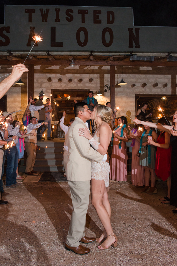 Taking place at the rustic Texas wedding venue, Twisted Ranch, this wedding blends together a feeling of elegance romance with a country chic location. From the photographer: On New Year’s Eve, Kayla planned a fancy dress-up party for a few friends. Just before the clock struck midnight, a friend pulled Kayla away from the party to discuss a “crisis.” When they came back down, Kayla walked outside to find her boyfriend at the end of a tunnel of sparklers. He got down on one knee and asked Kayla to be his wife and walk by his side forever. She said yes and the two were married at Twisted Ranch near Austin, Texas. Thanks to Eureka Photography for sharing this romantic wedding.