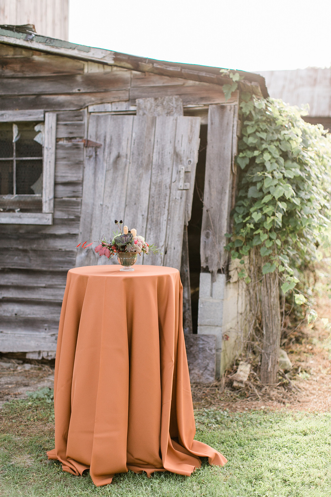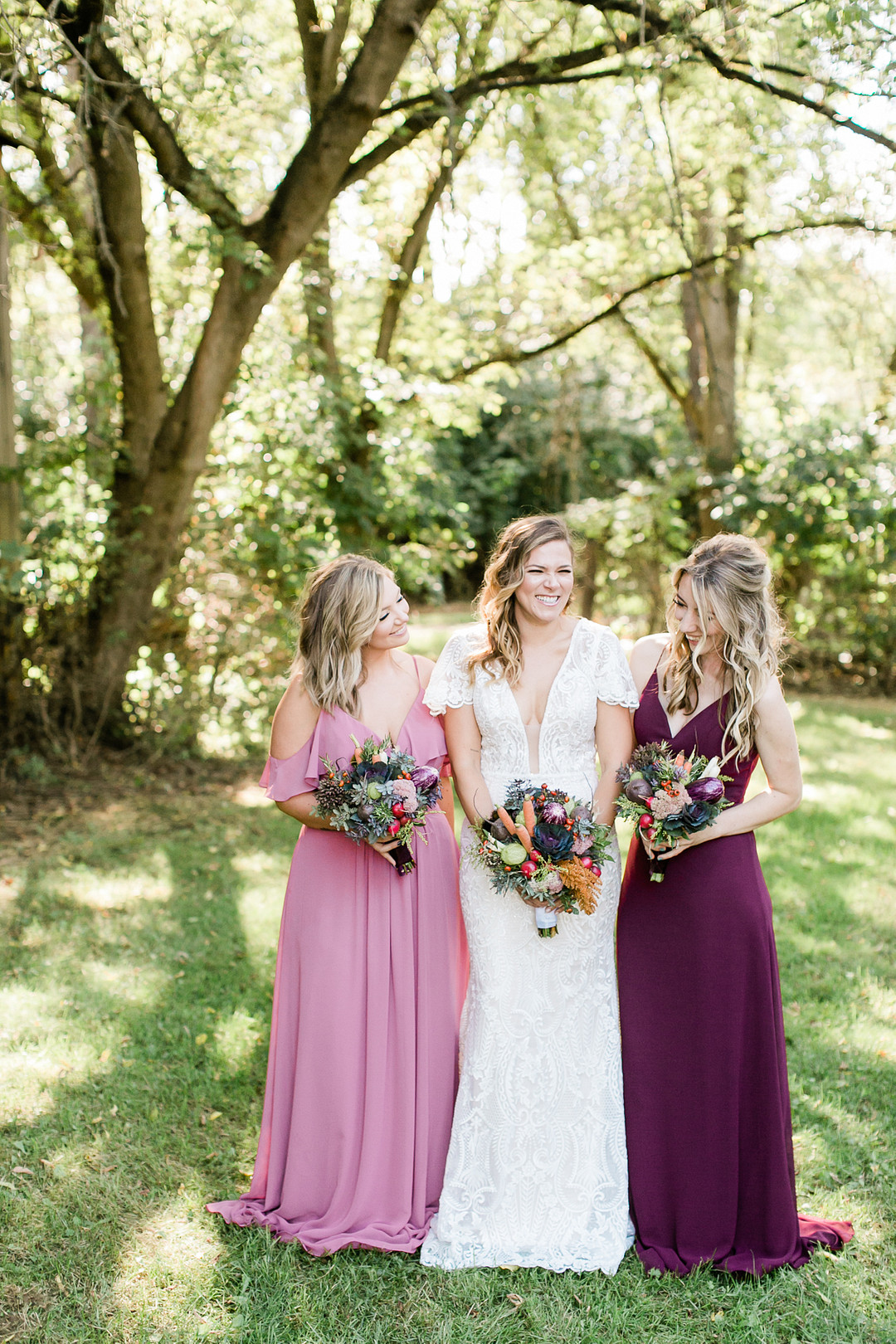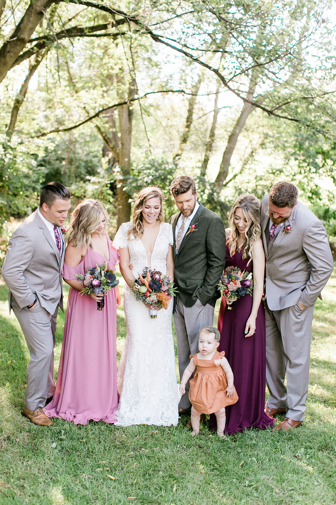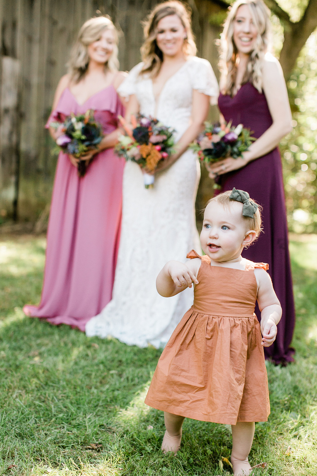 “The bridesmaids wore rich tones of eggplant and mauve gowns, and the flower girl stole the show in a terracotta dress. The bouquets were rich in color and texture alike. A seamless combination of produce and florals created the most visually striking bouquets.” – Jana Scott Photography