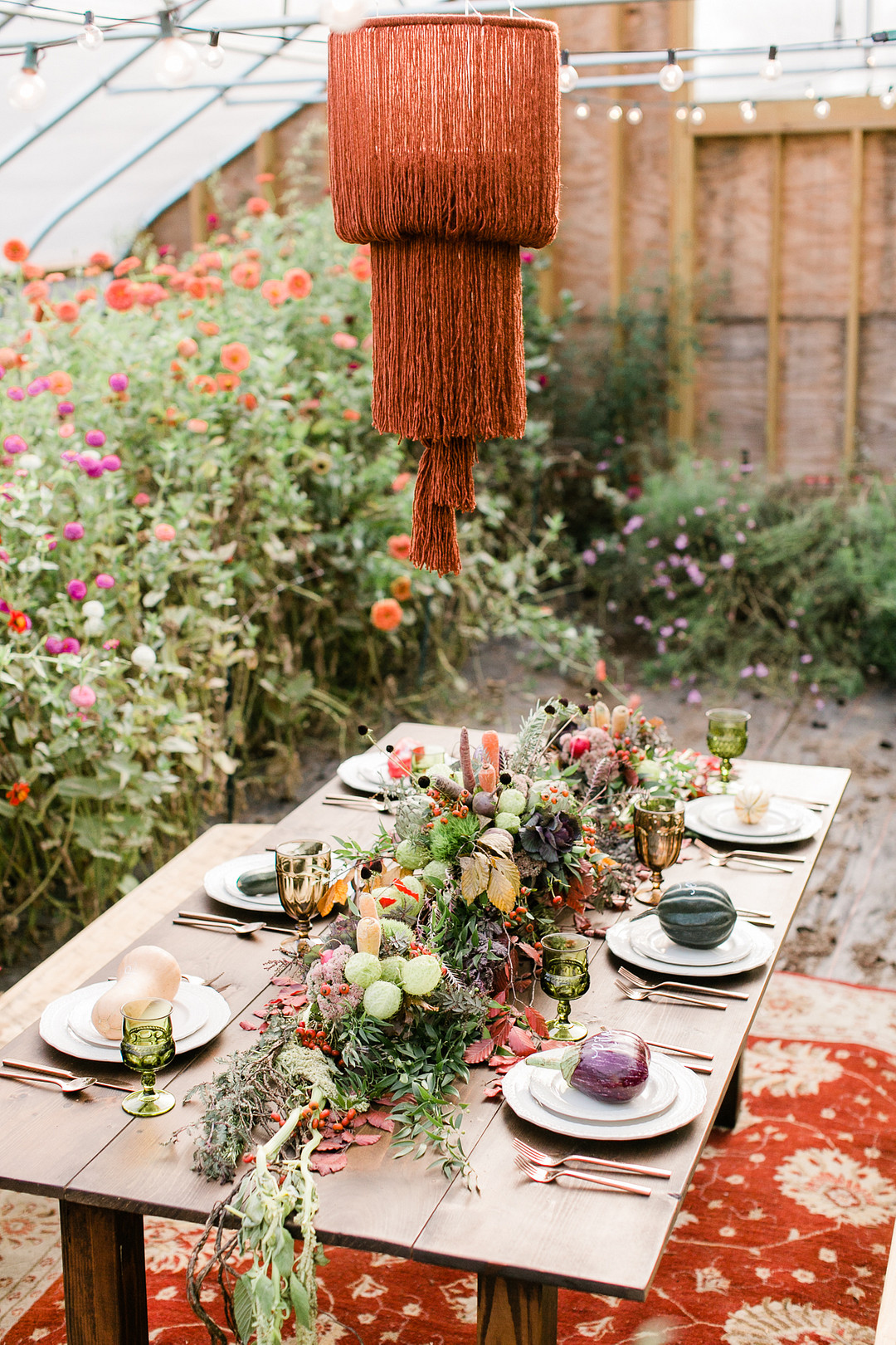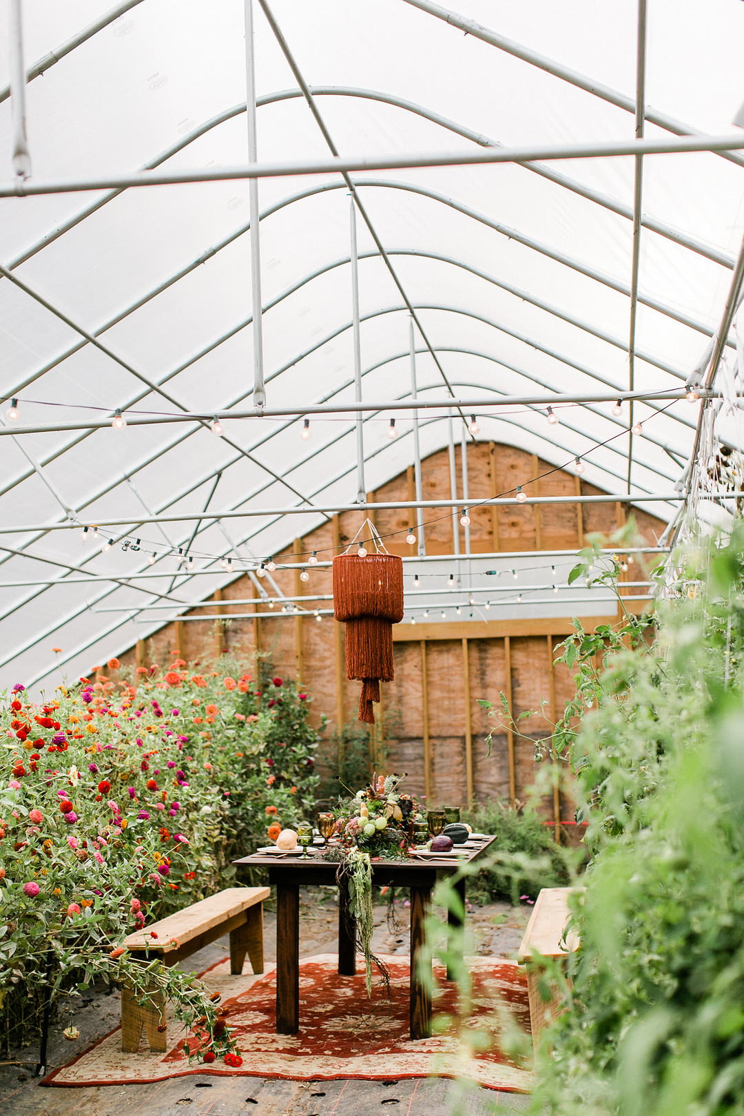 “The greenhouse was the perfect backdrop for our ceremony, but once we opened the doors, it transformed into a unique and colorful reception space. A farm table, vintage rug, and handmade macrame chandelier nested perfectly between rows of florals and produce.” – Jana Scott Photography