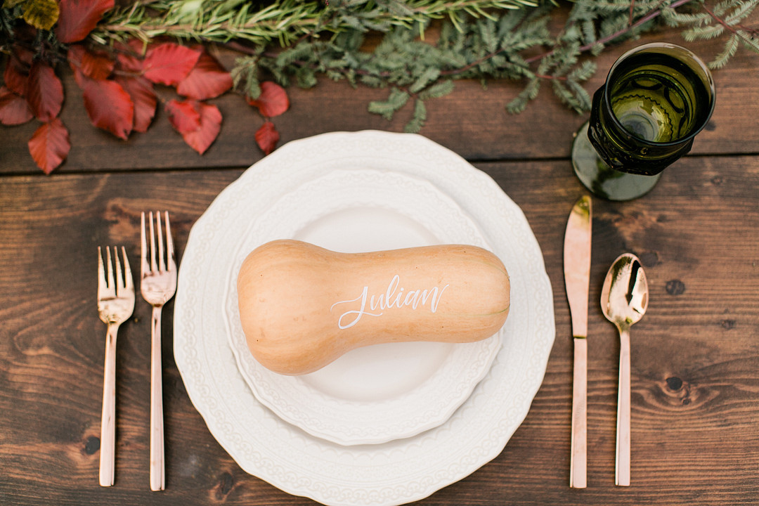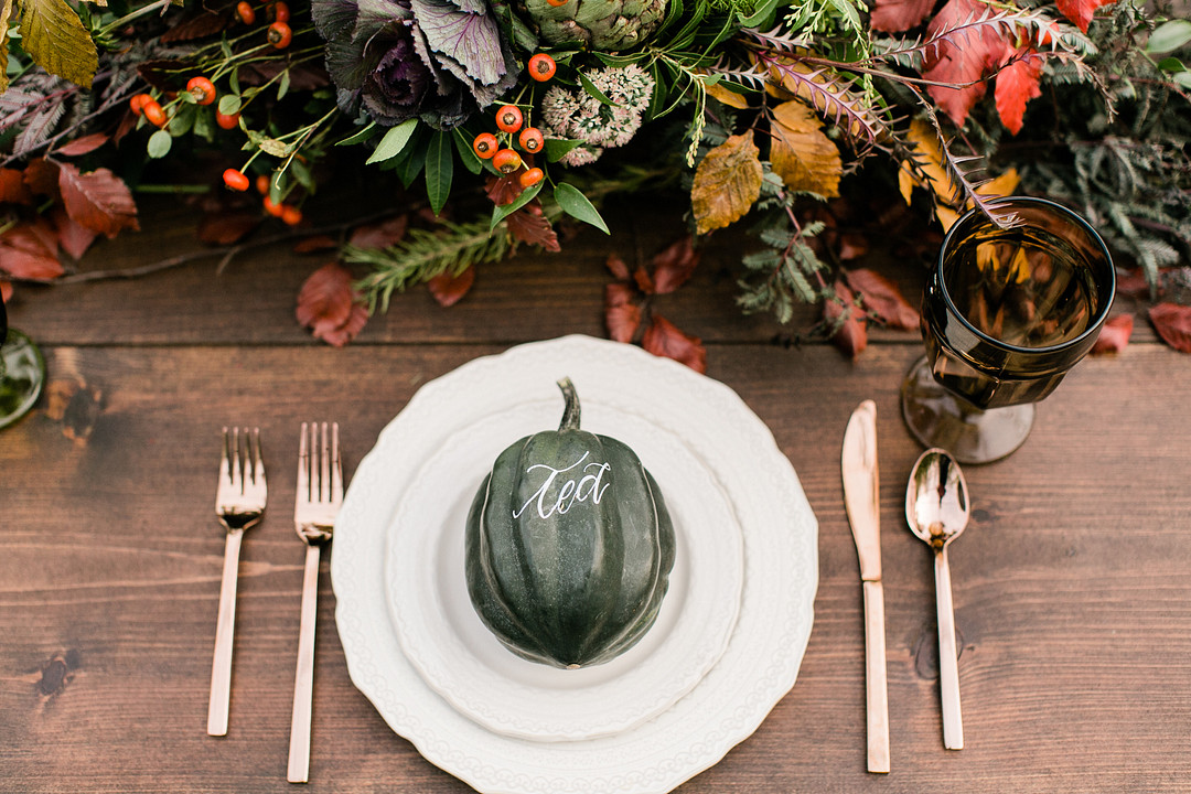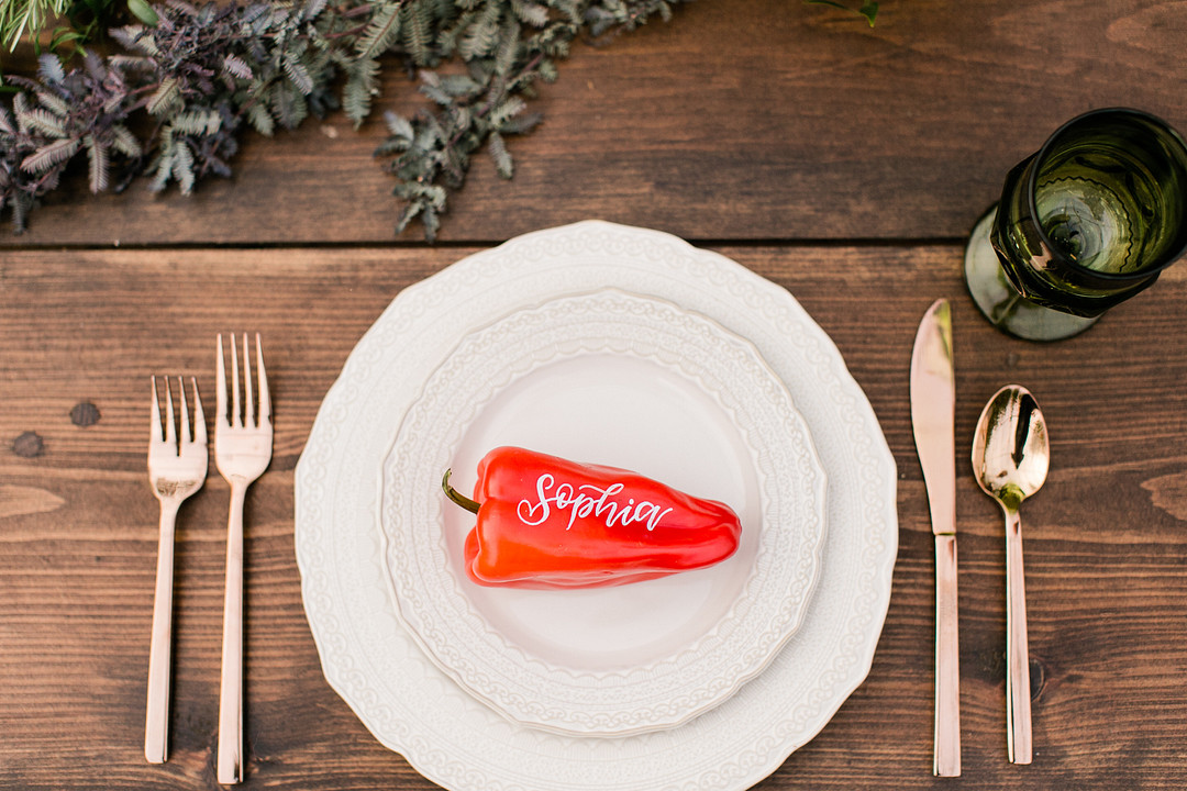 “The calligrapher used a variety of vegetables as the medium for the place cards.” – Jana Scott Photography