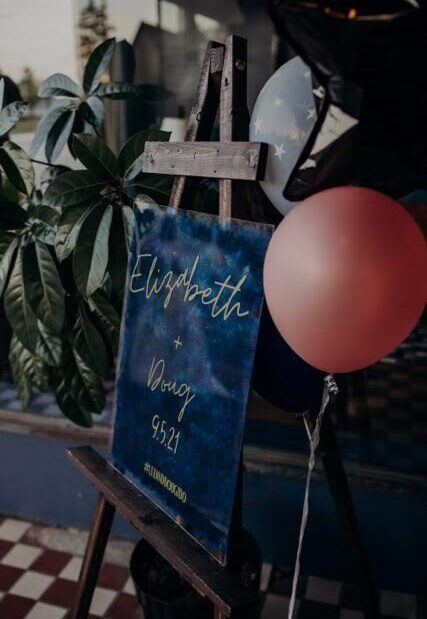 “Our wedding theme was “starry night” and my favorite DIY element was the balloons from a local party planning place — they were giant moons and stars. They were gorgeous!” — Liz