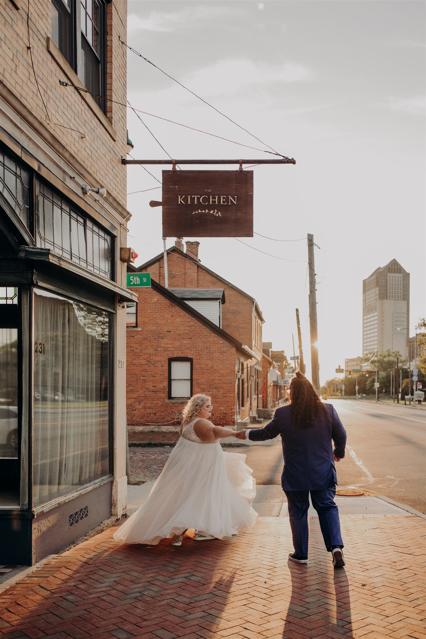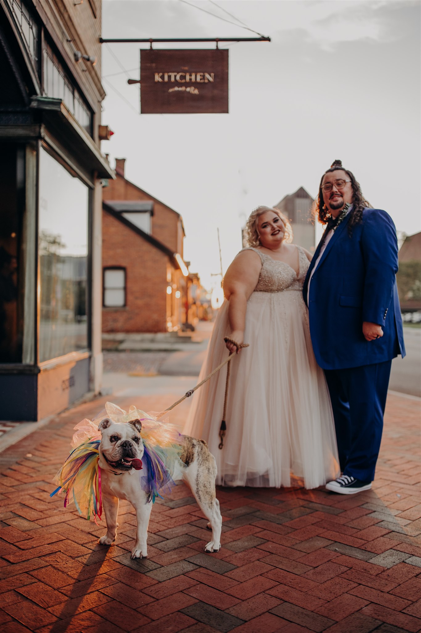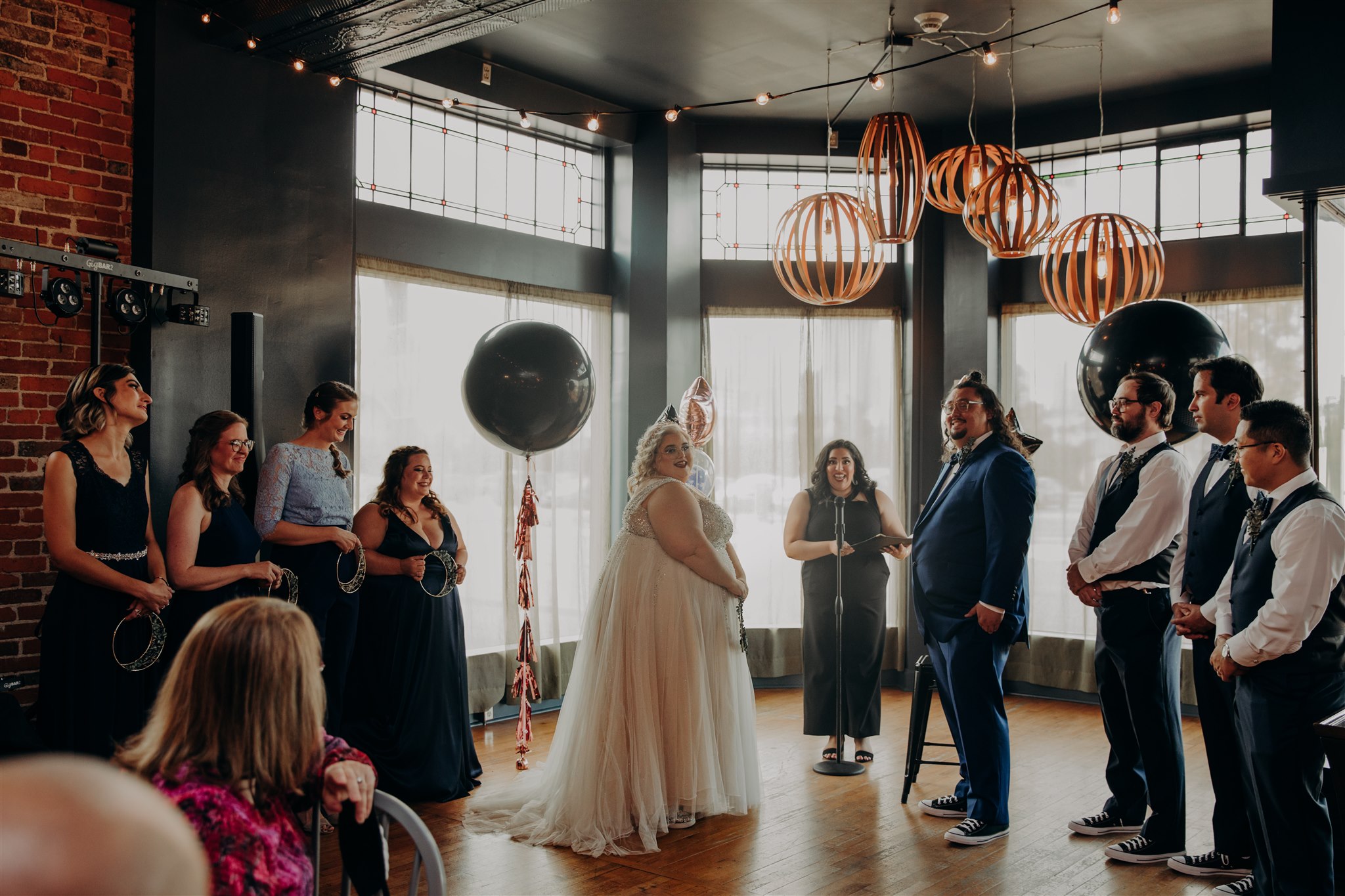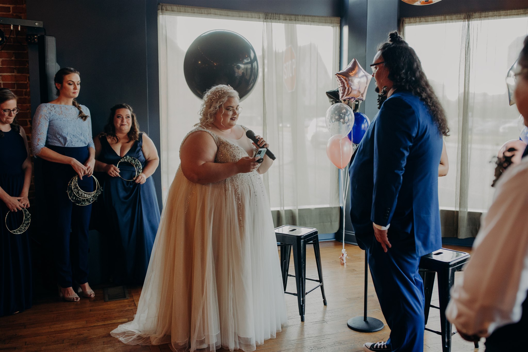 Get your Pinterest boards ready because we’re starry eyed over this urban chic wedding in Columbus, Ohio! From the moody color palette to the celestial decor elements, we love how every detail came together in a most perfect way. Keep reading to see more from Liz (content creator behind @snackincbus) and Doug’s fun-filled, special day!