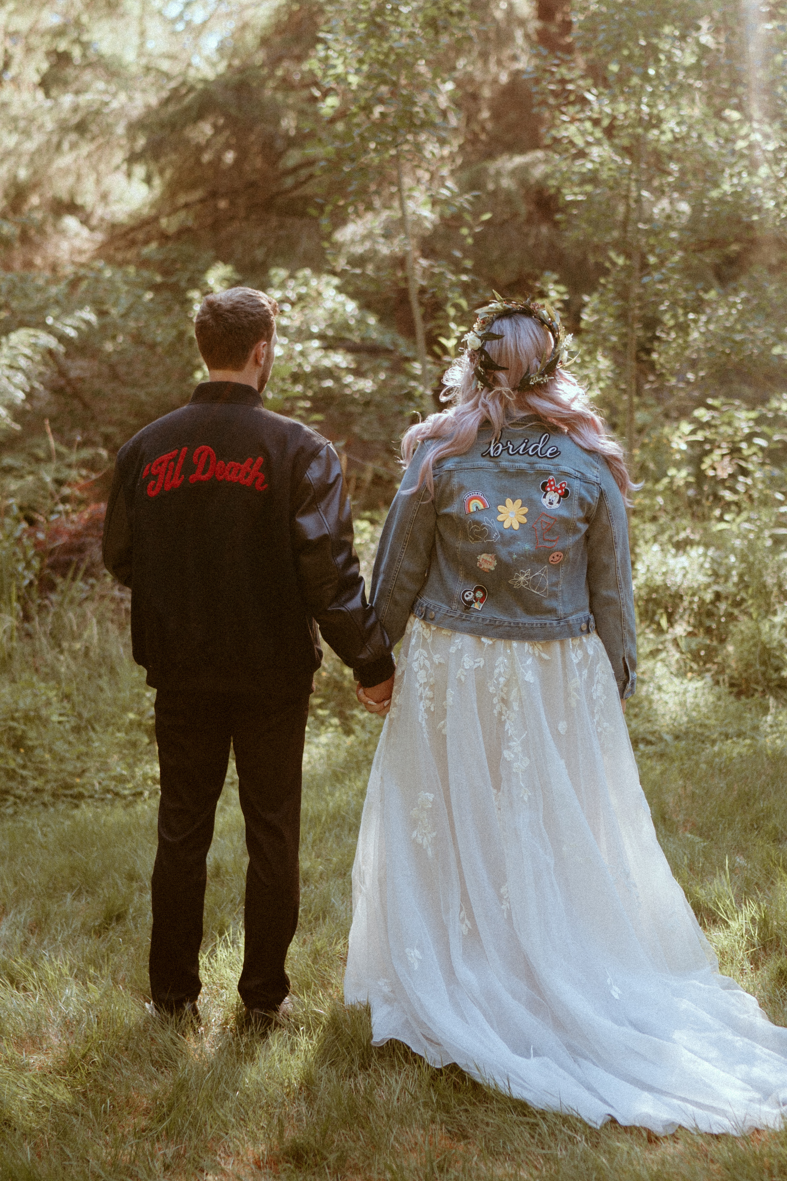 “Something I knew I wanted us to have for our reception was personalized jackets for the bridal party. I put together an all-black leather letterman’s jacket for him and eccentric denim jackets for me. They made for the cutest photo op!” – Katie