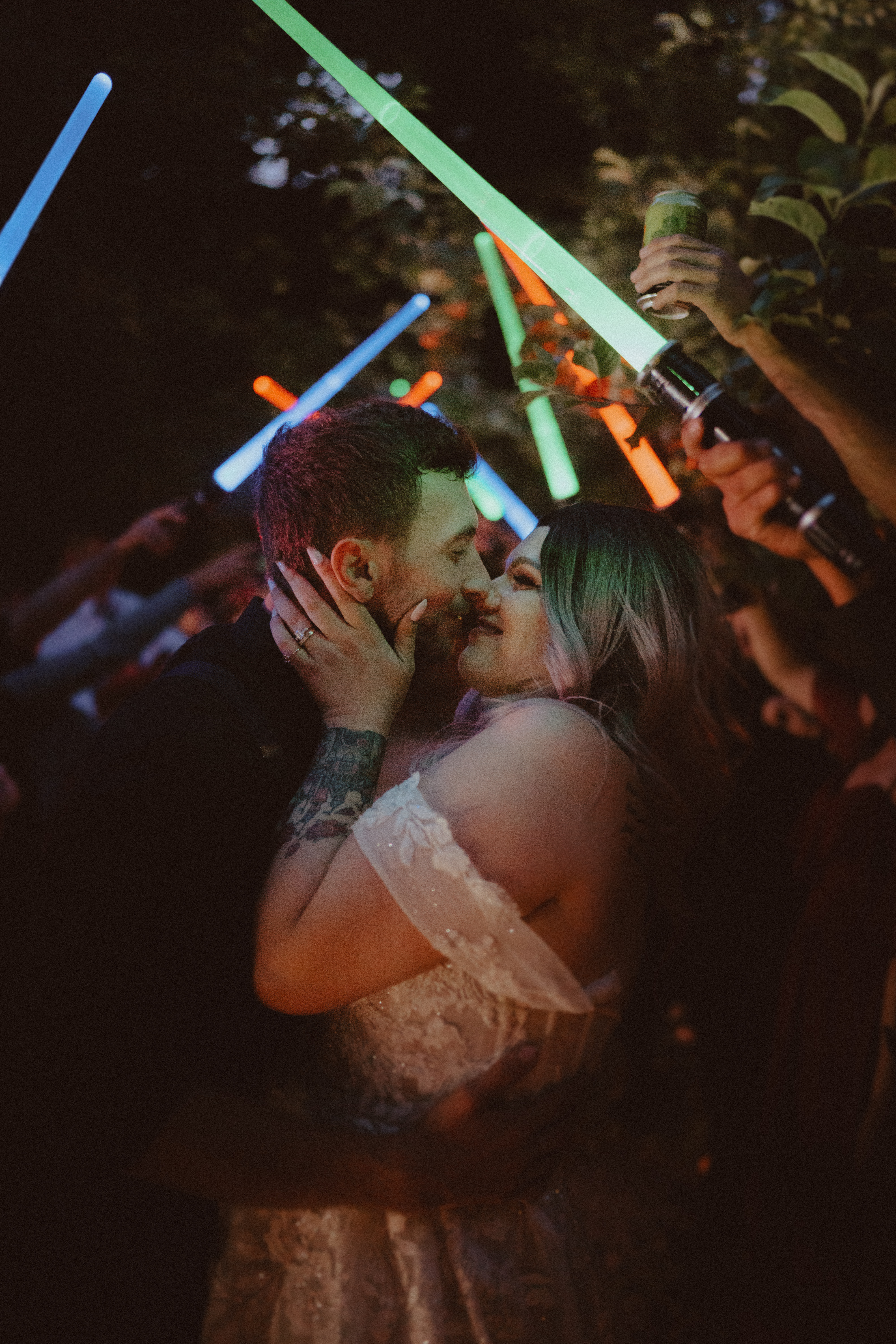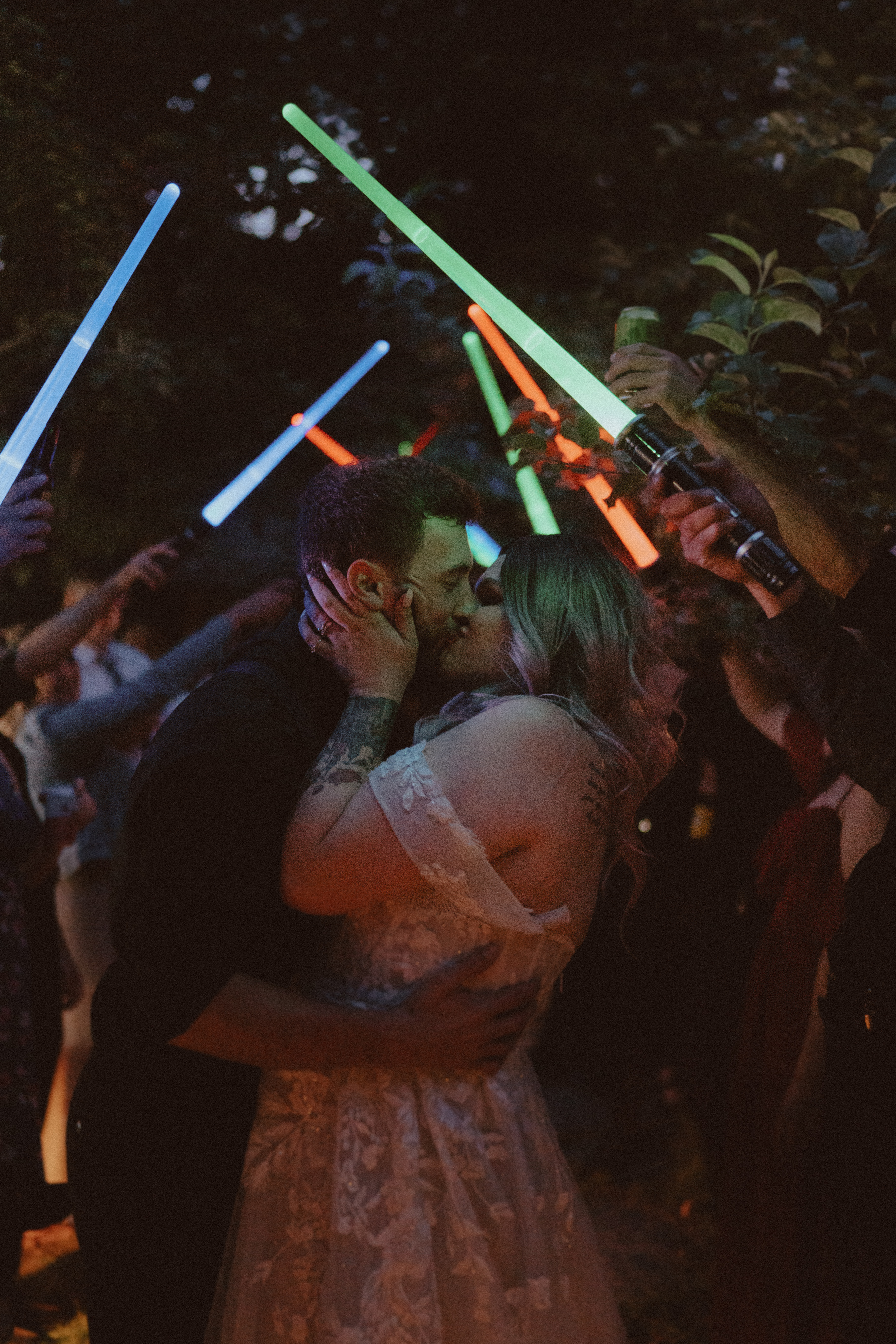 “Something we knew we wanted to do from the very beginning stages of our wedding planning was a lightsaber tunnel send-off, and it did not disappoint! Our DJ played the Imperial March and we felt so freaking cool. Nerds in love for the win!” – Katie