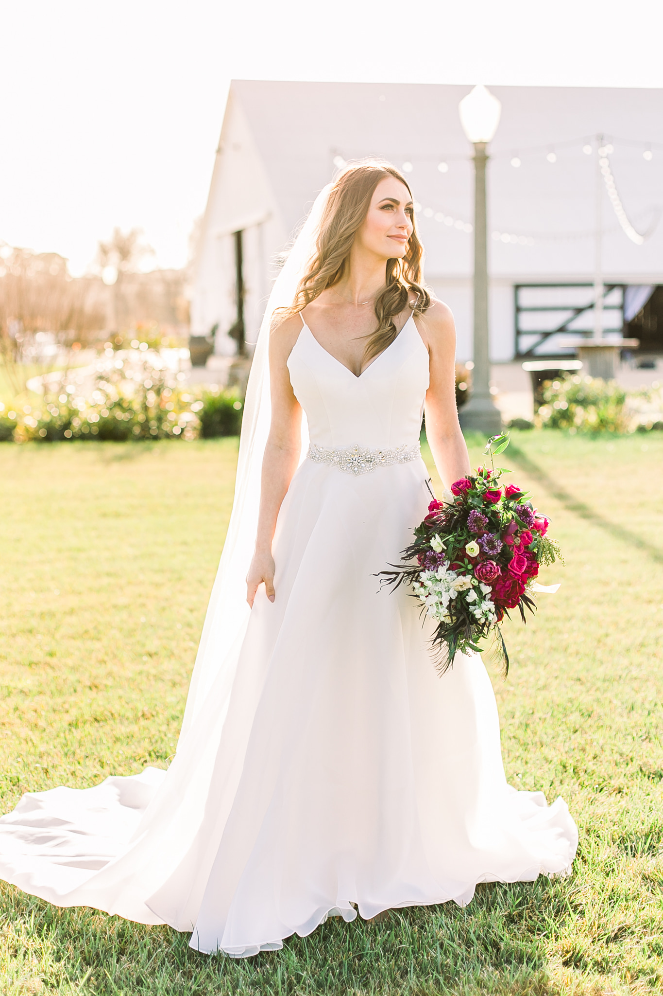 The highlight of the shoot was our lounge space by Embellish Vintage Rentals. Since the barn offers such a clean backdrop, we decided the lounge should be bold with a velvet emerald green couch, purple chairs, and teal stools. The gold accents shined in the beautiful golden sunset.